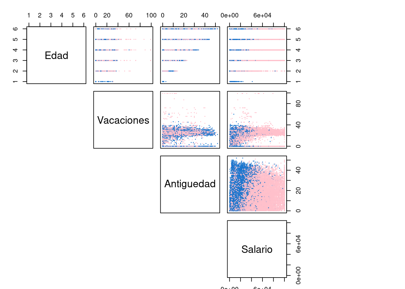Veamos ahora en 2D las clasificaciones y observamos que la variable Salario parece discriminar muy bien las clases cuando la juntamos con cualquiera de las demás, ya que se ven los colores de ambas clases separados en la última columna.