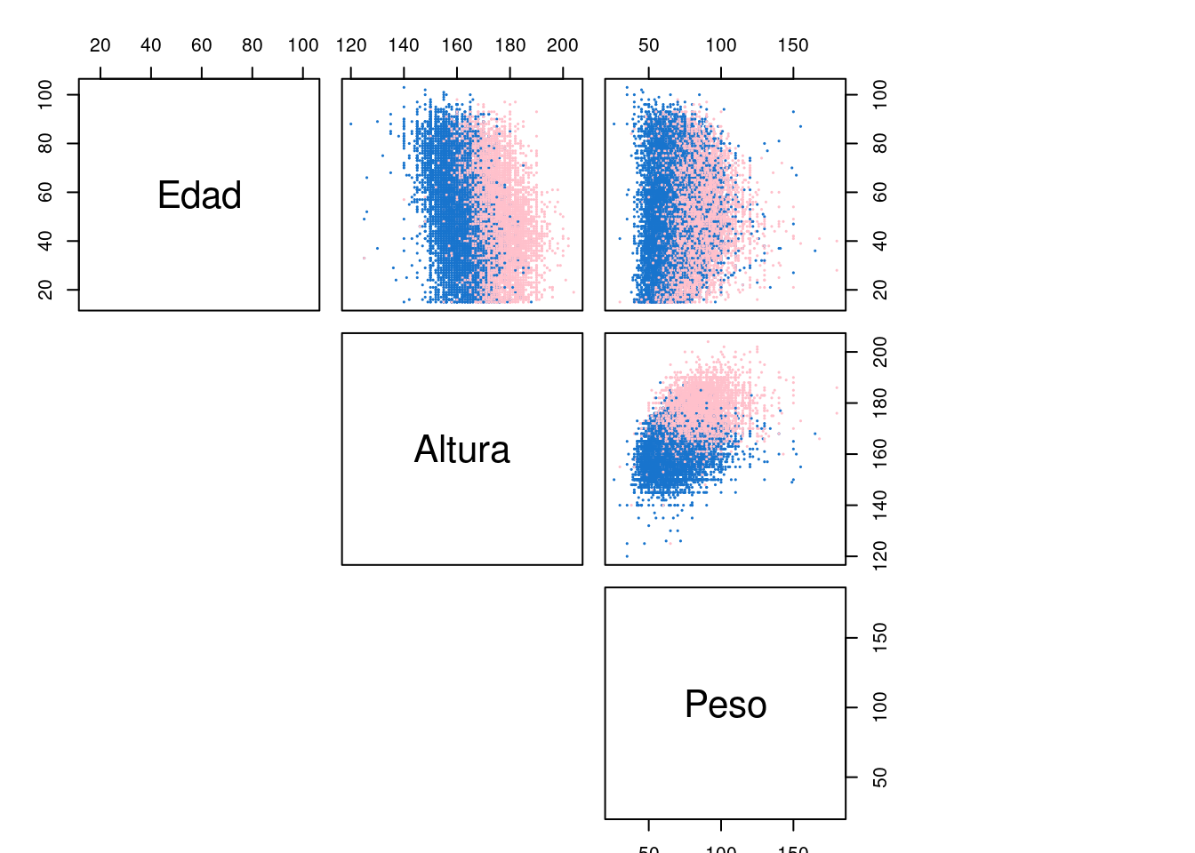 Como cabía esperar, la variable edad no discrimina bien el sexo de una persona debido a que no hay una relación directa. Sin embargo, tanto en las variables peso como altura se observa como la clase 1 (hombres) muestran valores más altos que las mujeres en ambas variables. Esto puede ser un buen indicador a la hora de discriminar.