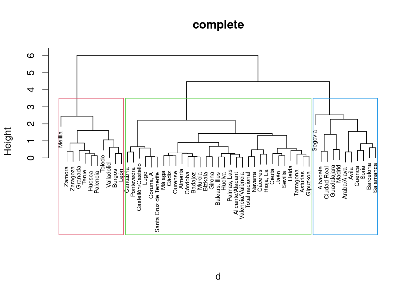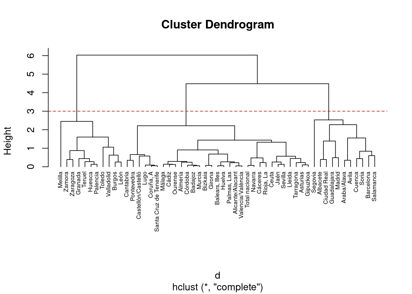 En cuanto al método para hacer los clusters, vamos a dejar el que viene por defecto, el complete. Este se basa en medir la distancia entre clusteres como la distancia más larga entre cualquier punto de un cluster y cualquier punto del otro cluster. Menos sensible a valores atípicos, pero puede generar clusteres de tamaño desigual.