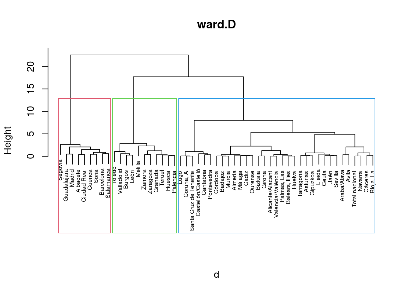 El objetivo de este estudio será aplicar un Análisis Cluster para hacer grupos de provincias en función de las variables 1Ola y 2Ola. Concretamente usaremos un cluster jerárquico.