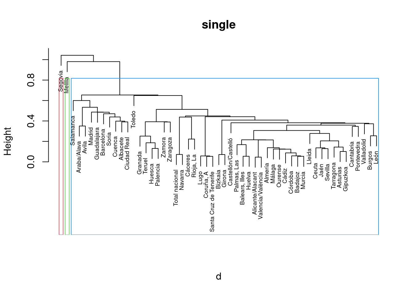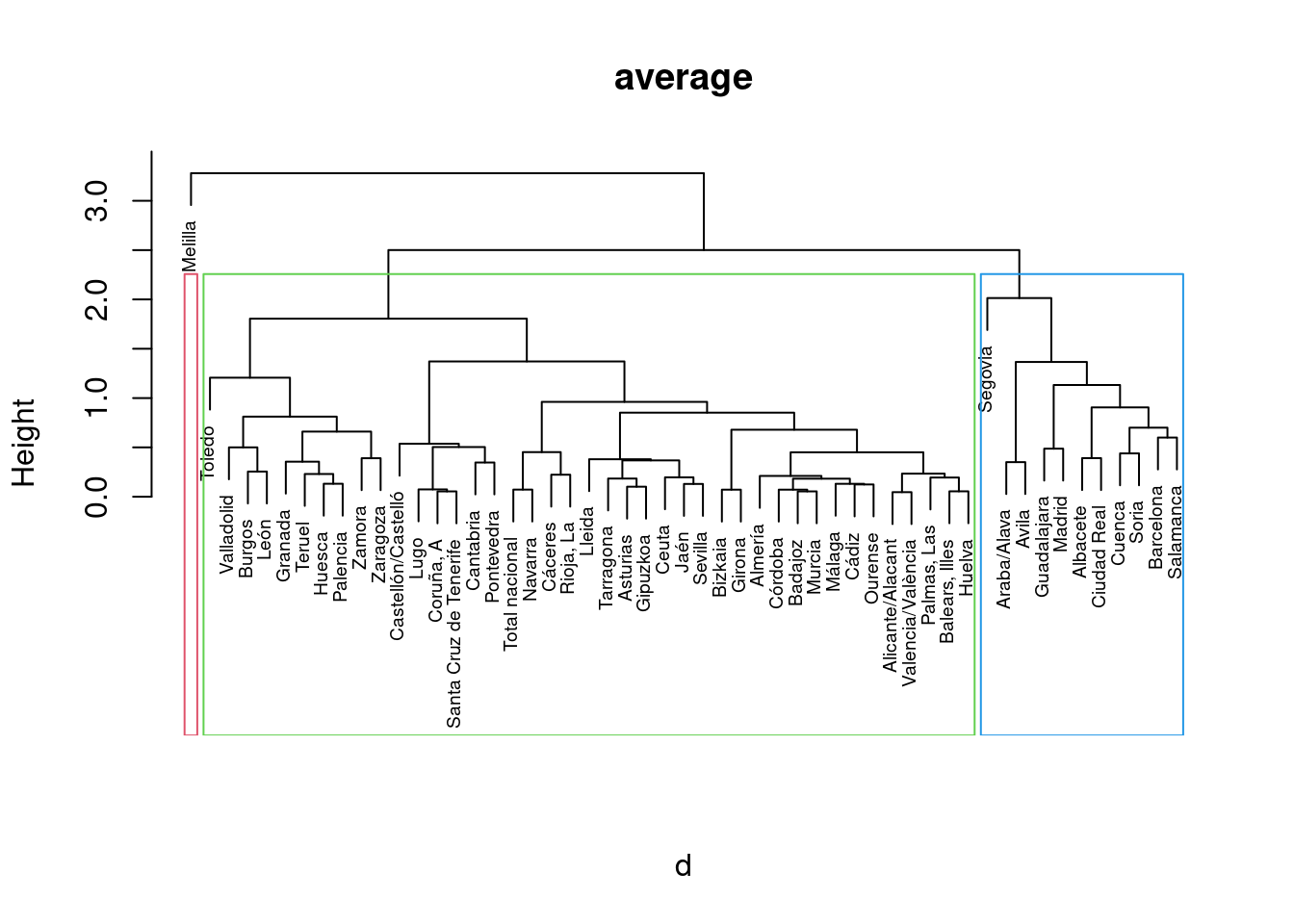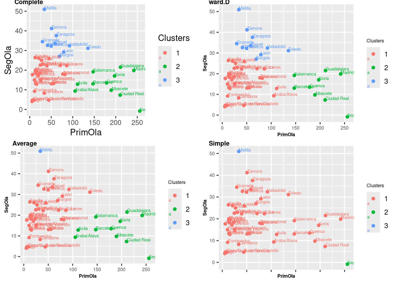 Notar que la distancia más apropiada para usar es la Euclidea ya que ambas variables 1Ola y 2Ola son del mismo tipo y corresponden a meses consecutivos, es decir, representan el mismo fenómeno demográfico y en la misma escala (una vez hayamos escalado). Además como estamos interesados en la diferencia de estas variables a la hora de hacer cluster, esta es la distancia más adecuada.