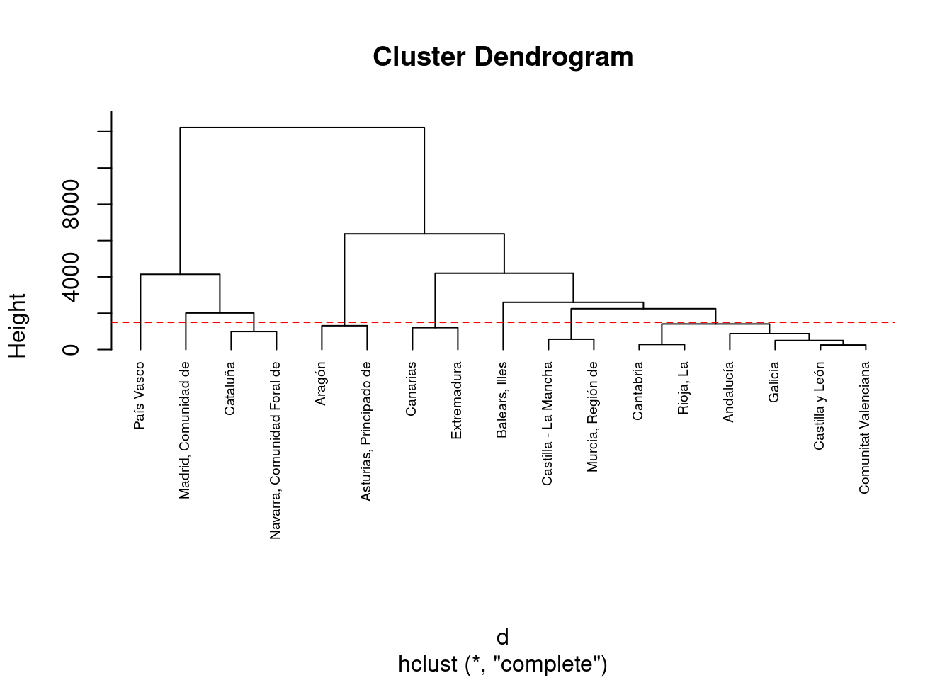 En cuanto al método para hacer los clusters, vamos a dejar el que viene por defecto, el complete. Este se basa en medir la distancia entre clusteres como la distancia más larga entre cualquier punto de un cluster y cualquier punto del otro cluster. Menos sensible a valores atípicos, pero puede generar clusteres de tamaño desigual.