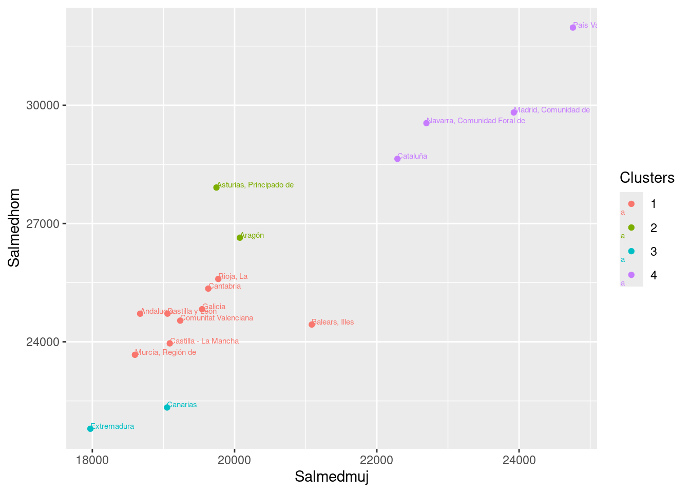 Los clusters se forman de manera clara, con diferencias notables en los salarios medios de hombres y mujeres entre ellos.