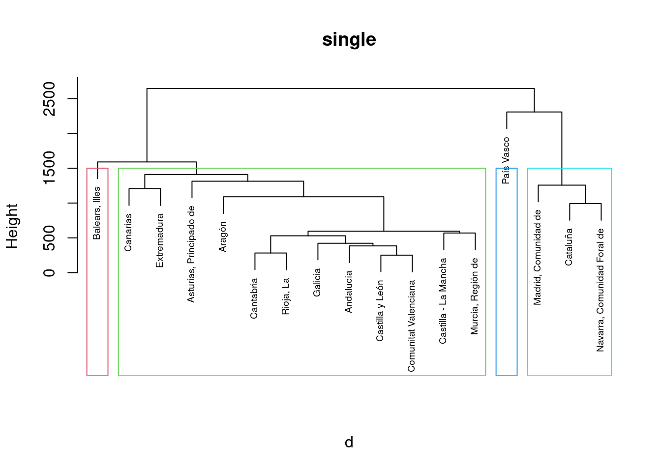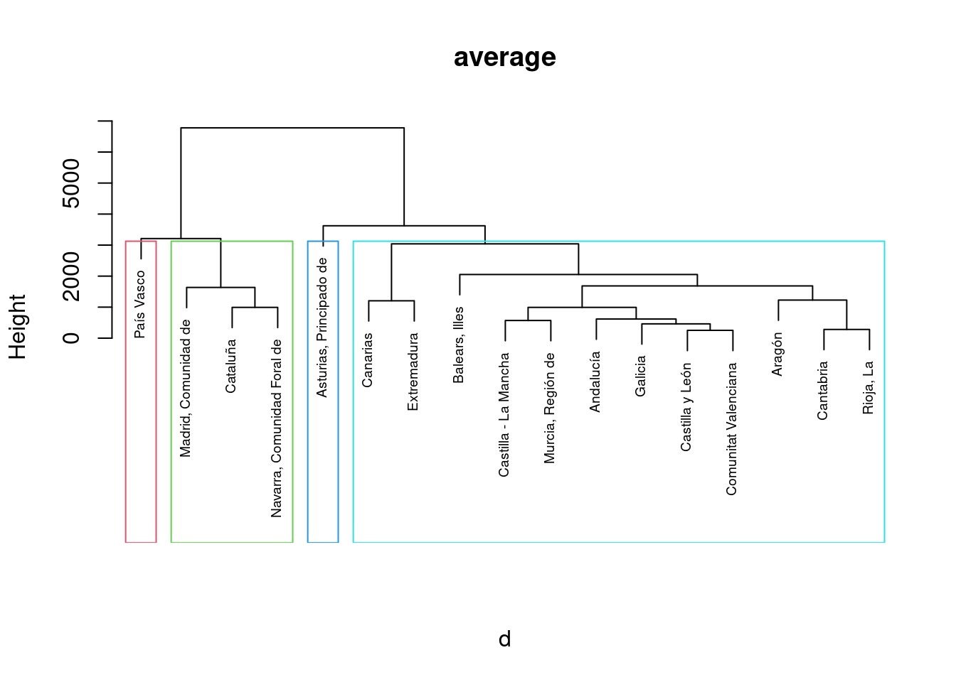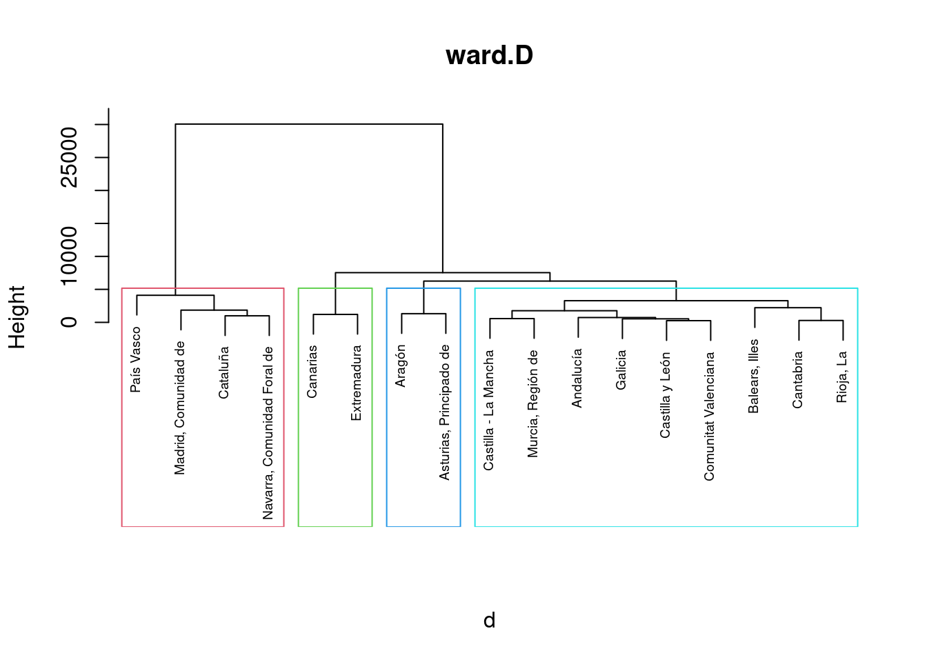 Aquí se han explicado los supuestos del cluster jerárquico por medio de un dataset que contiene el salario medio entre hombres y mujeres por comunidades autónomas. Se ha indicado como elegir una función de distancia en función de los datos, un número inicial de clusters de acuerdo a los intereses del usuario y una posterior elección óptima de acuerdo con diversos métodos.