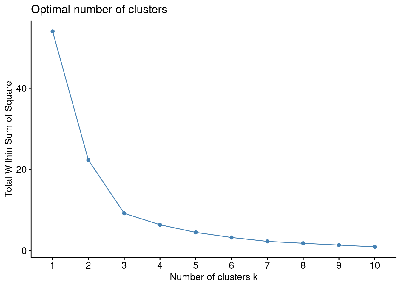 En el gráfico proporcionado, buscamos el “codo” del gráfico, que es el punto donde la suma total de cuadrados dentro de los clusters (total within-cluster sum of squares) deja de decrecer significativamente con la adición de más clusters.