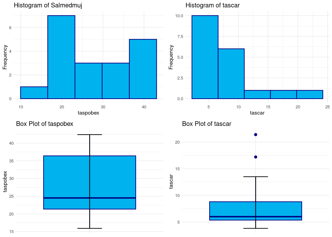 grid.arrange(histogram, histogram2, boxplot, boxplot2, nrow = 2, ncol = 2, widths = c(0.3, 0.3))