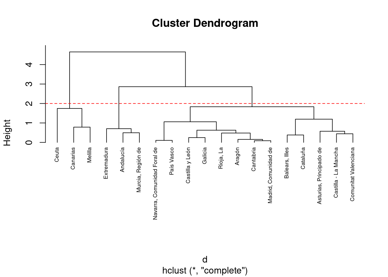 Notar que la distancia más apropiada para usar es la Euclidea ya que ambas variables son del mismo tipo, tasas, y representan el mismo fenómeno demográfico y en la misma escala (una vez hayamos escalado). En cuanto al método para hacer los clusters, vamos a dejar el que viene por defecto, el complete. Este se basa en medir la distancia entre clusteres como la distancia más larga entre cualquier punto de un cluster y cualquier punto del otro cluster. Menos sensible a valores atípicos, pero puede generar clusteres de tamaño desigual.