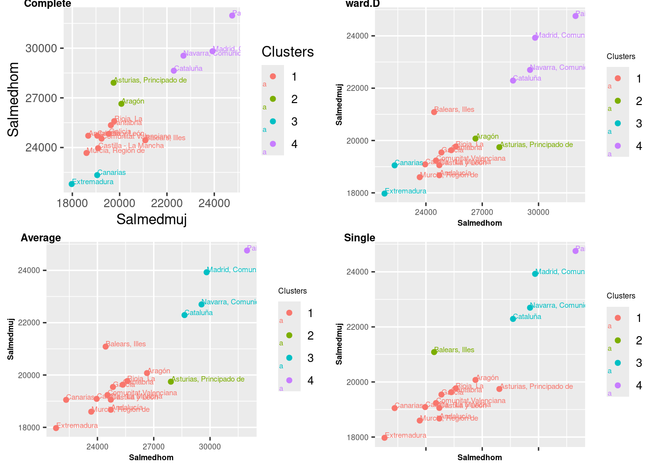 Los resultados son en general coherentes, pero el método de Ward.D parece ofrecer la estructura de clusters más clara y significativa, con una mejor separación de las comunidades autónomas según sus salarios medios. Complete y Average también proporcionan agrupaciones razonables, aunque no tan claras como Ward.D. Single, aunque útil en ciertos contextos, no parece tan adecuado para este análisis debido a su tendencia a crear clusters menos intuitivos.