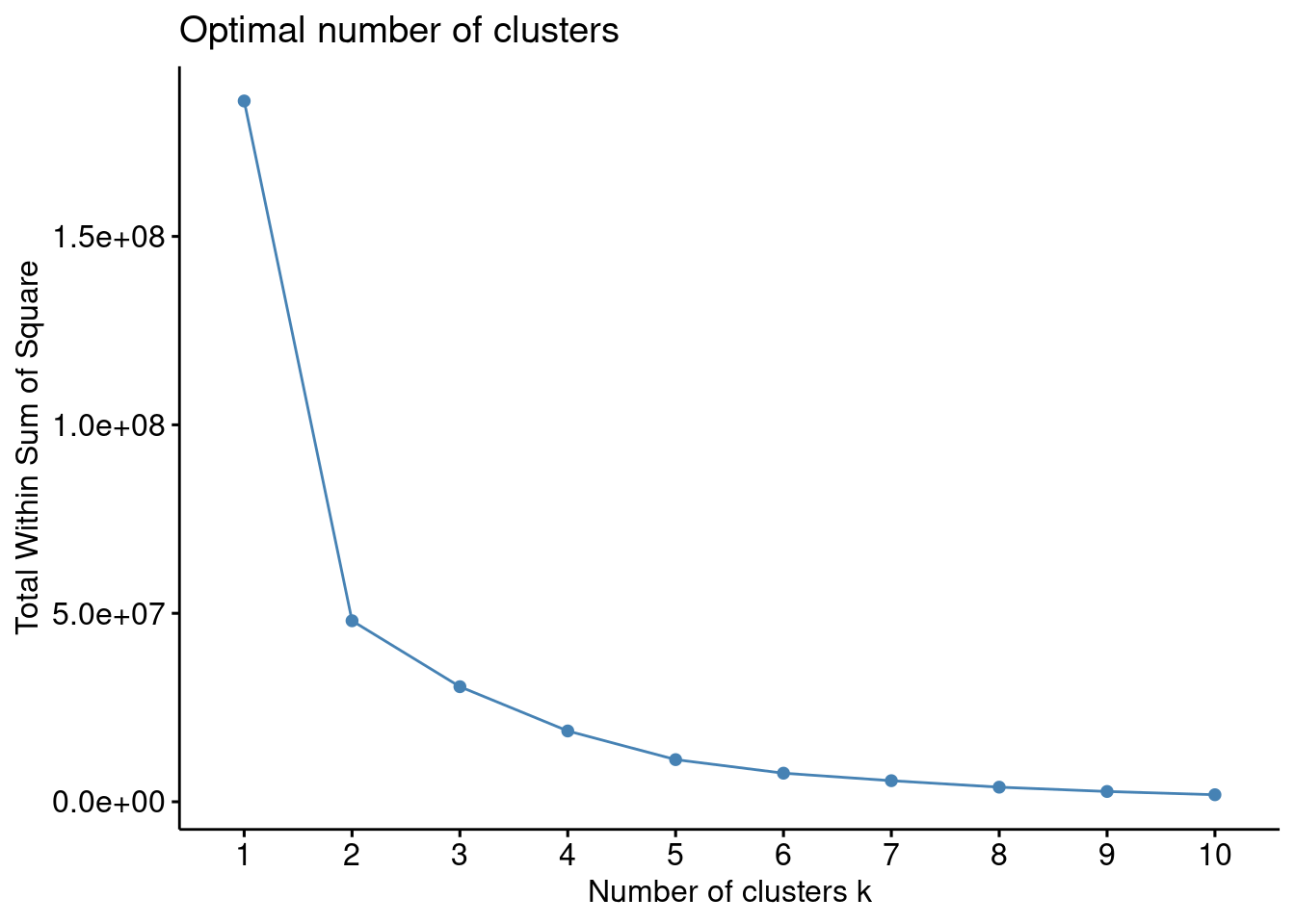 En el gráfico proporcionado, buscamos el “codo” del gráfico, que es el punto donde la suma total de cuadrados dentro de los clusters (total within-cluster sum of squares) deja de decrecer significativamente con la adición de más clusters.