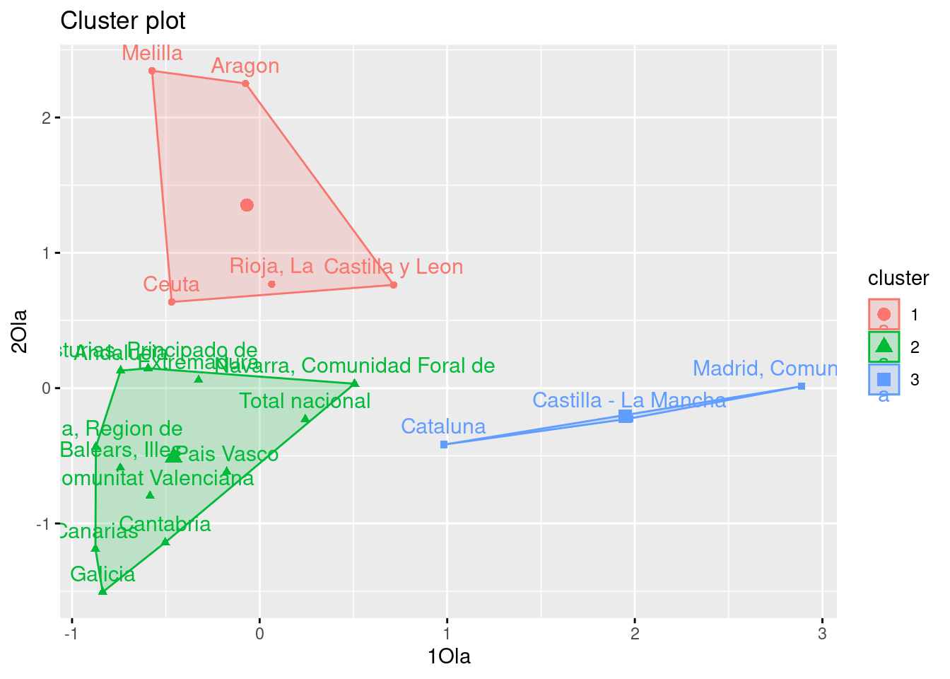 El objetivo de este estudio será aplicar un Análisis Cluster para hacer grupos de comunidades autónomas en función de las variables 1Ola y 2Ola. Concretamente usaremos un cluster K-Means