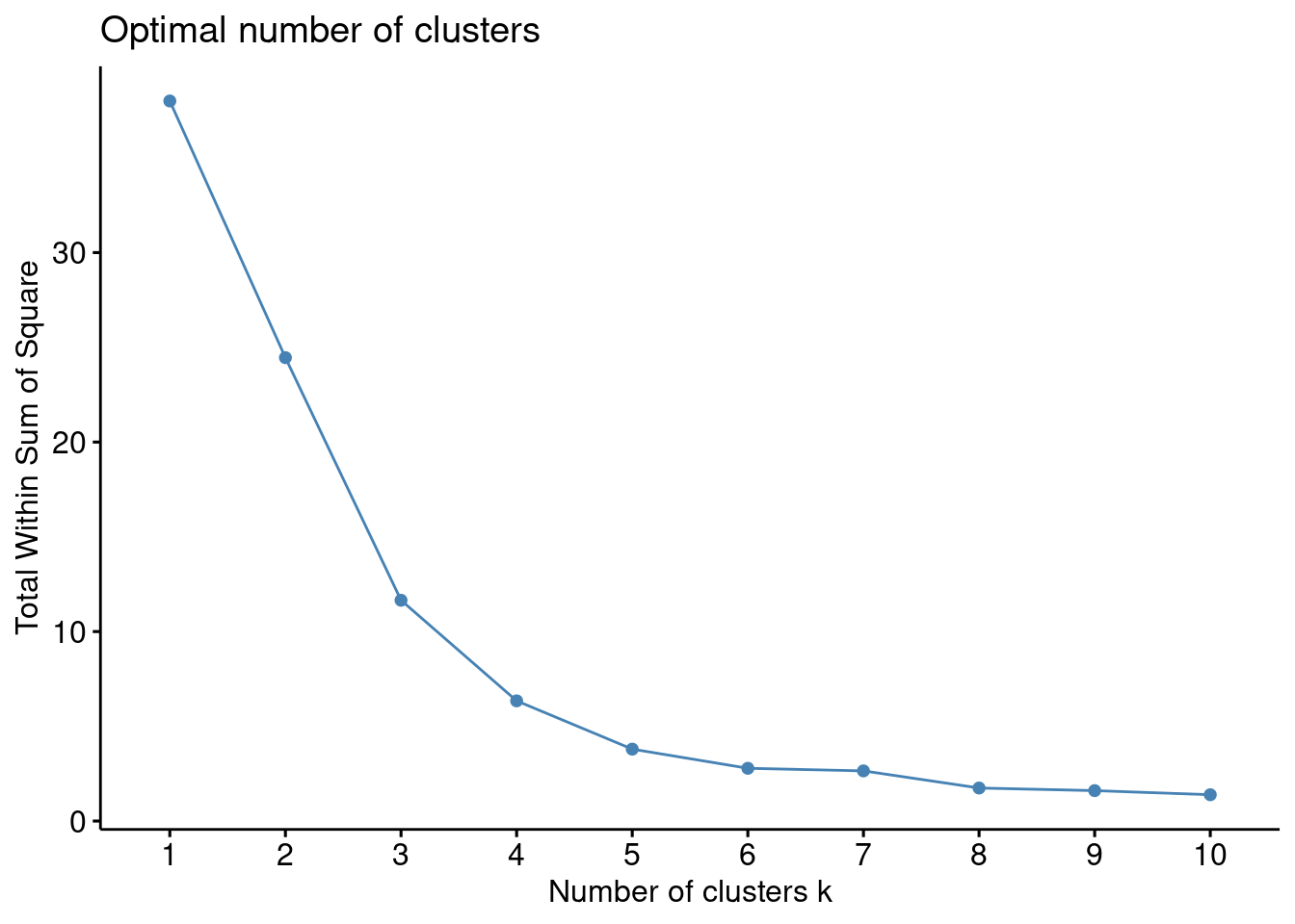 Concretamente, el Cluster K-Means define clusters de modo que se minimice la variación total dentro del grupo de acuerdo con el algoritmo Hartigan-Wong (Hartigan y Wong 1979), que define la variación total dentro del grupo como la suma de las distancias al cuadrado de las distancias euclidianas entre elementos y el centroide correspondiente. Se describe a continuación.