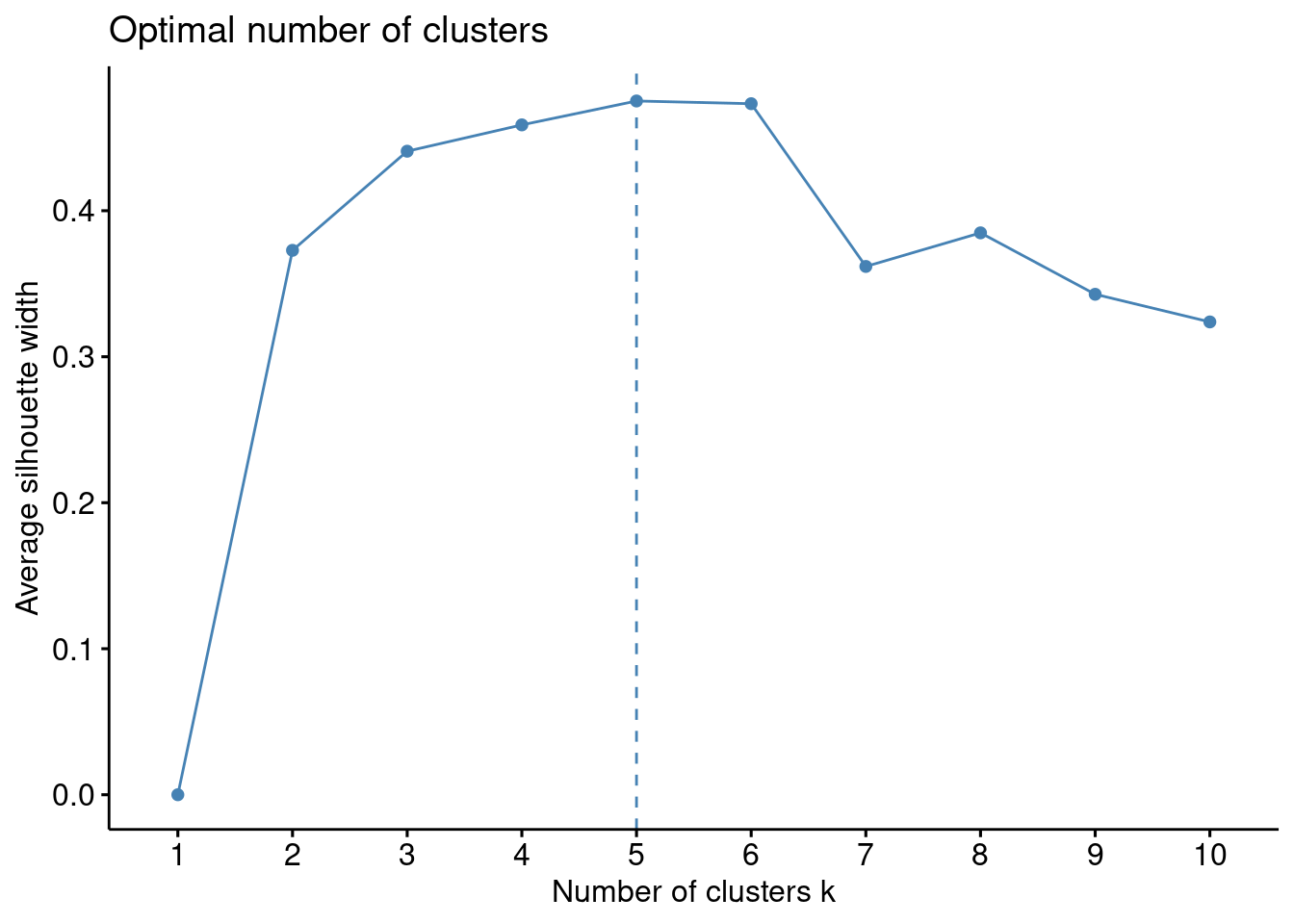 El número óptimo de k parece ser 3 que es donde más se reduce la pendiente y la variabilidad explicada no parece disminuir de forma tan rápida. De todos modos, también podría parecer razonable tomar el 4 o 5. Es por ello que vamos a usar algún método adicional.
