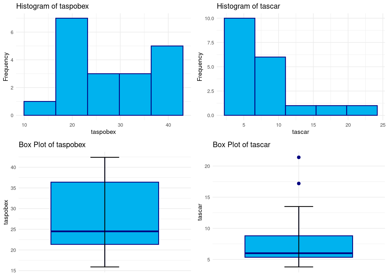 La tasa de riesgo de pobreza o exclusión social (taspobex) no solo es generalmente más alta, sino que también presenta una mayor variabilidad en comparación con la tasa de carencia material severa (tascar). La asimetría positiva en ambas variables sugiere la presencia de algunas Comunidades Autónomas con tasas significativamente más altas que la mediana, especialmente en taspobex.