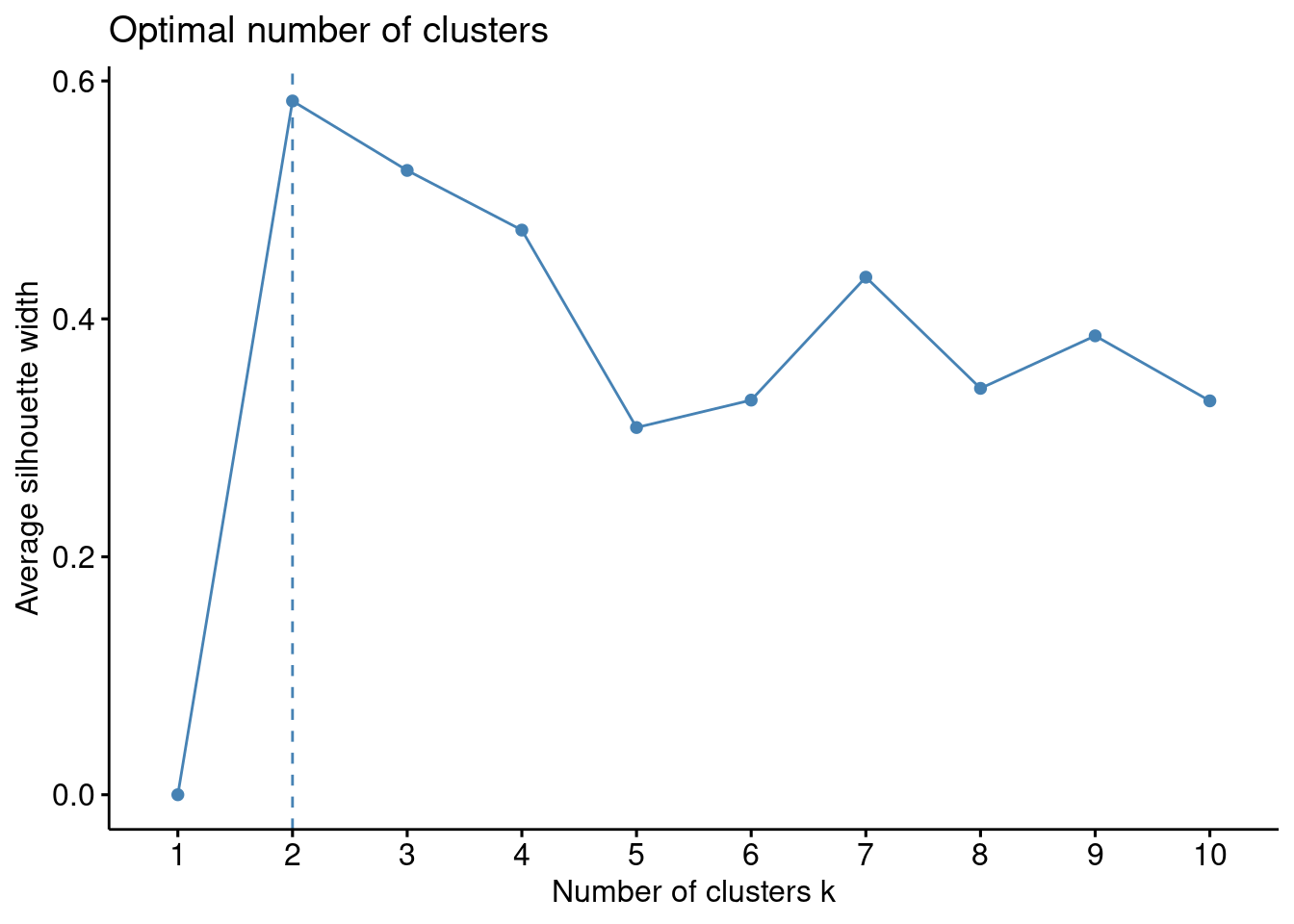 El número óptimo de k parece ser 3 que es donde más se reduce la pendiente y la variabilidad explicada no parece disminuir de forma tan rápida. De todos modos, también podría parecer razonable tomar el 2. Es por ello que vamos a usar algún método adicional.