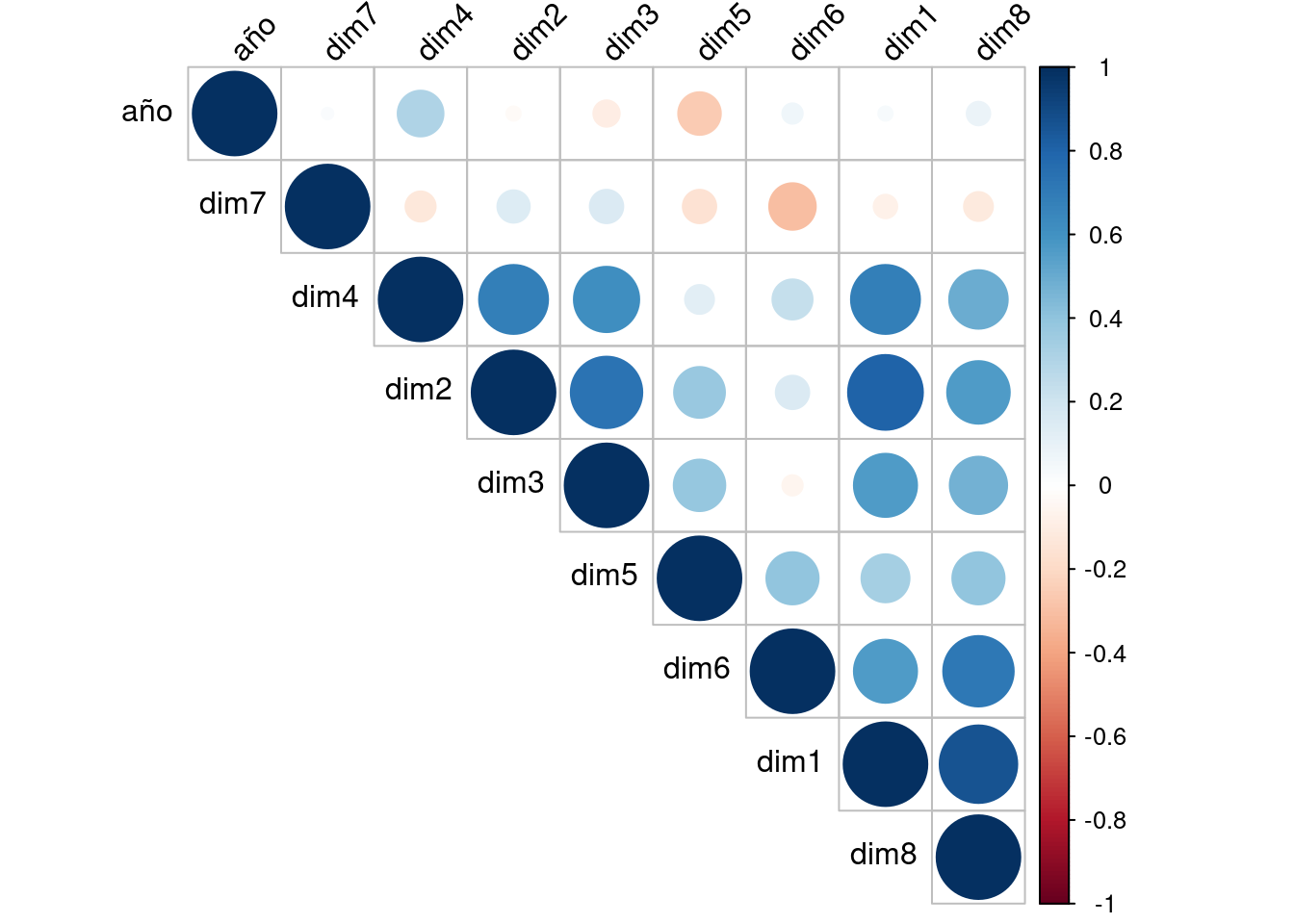 Combinando los resultados de la matriz anterior y el conocimiento de las variables es posible identificar variables que podrían generar el problema de multicolinealidad. De hecho si en el conjunto de datos hubiéramos tenido todas las dimensiones (de la 1 a la 9) y índice_total, hubiera habido un problema de colinealidad puesto que el índice total es la media aritmética del resto de dimensiones. Es por ello que se ha optado por suprimir la última dimensión.