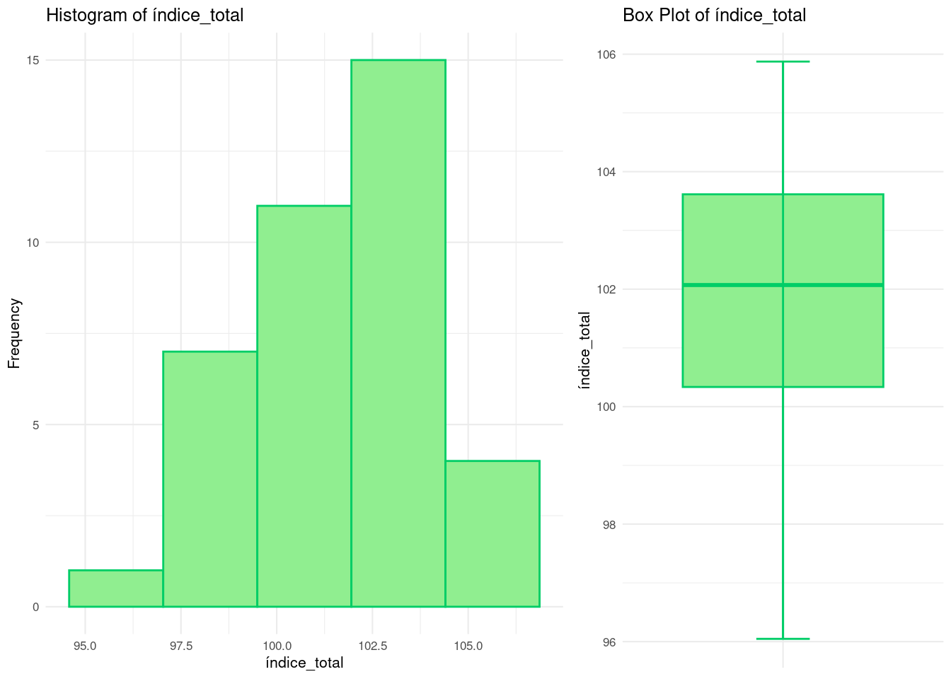 Realizando un resumen numérico vemos que todas las dimensiones toman valores en torno a \([90,110]\). Recordar que estas representan índices. Para ninguna de ellas parece haber valores atípicos en relación a los demás luego no parece necesario hacer ningún tipo de ajuste a los datos.