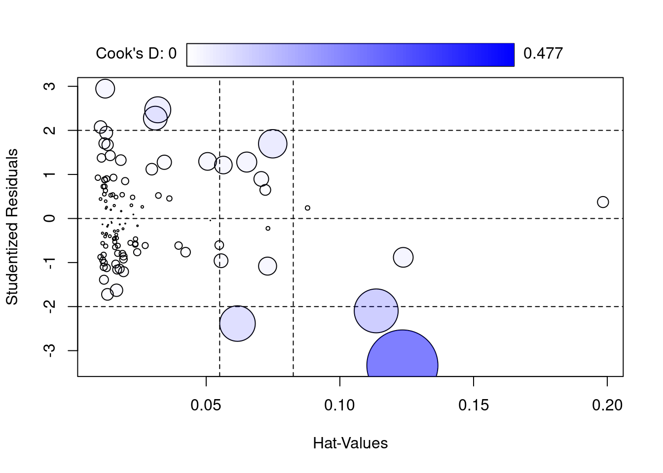 - El área de las burbujas es proporcional a la Distancia de Cook (mide cómo cambian los parámetros del modelo cuando se excluye una observación específica). Vemos que hay uno con una gran distancia de cook (tienen residuo grande), luego esto nos indica que podría considerarse en cierto modo atípico.