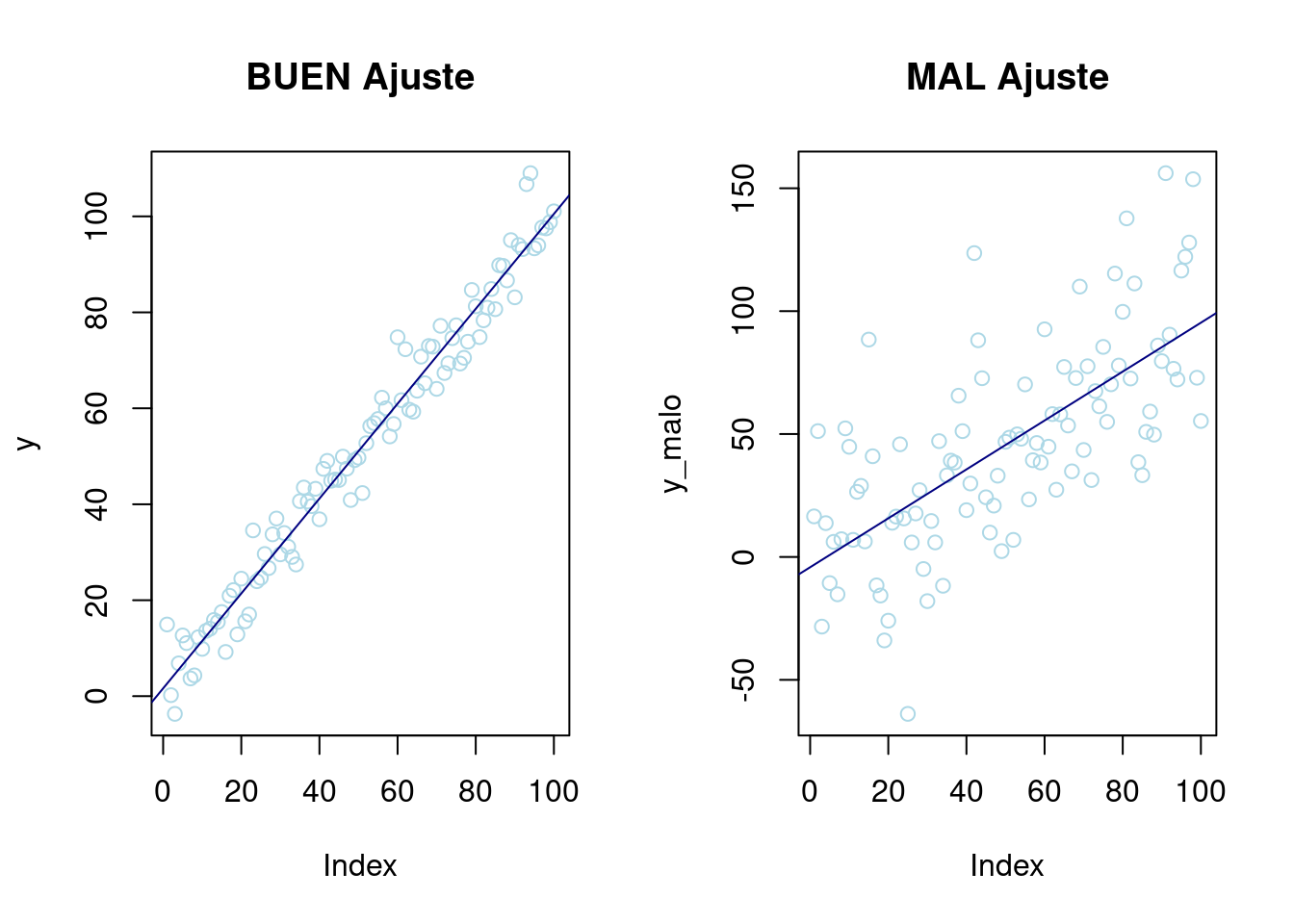 Antes de explicar las hipótesis que deben cumplir los datos para que el ajuste y como llevarlo a cabo, se va a mostrar un ejemplo de buen y mal ajuste. Intuitivamente cuanto mejor sea el ajuste de los datos a una recta cuando se representen las observaciones en un gráfico, mejor será el ajuste.