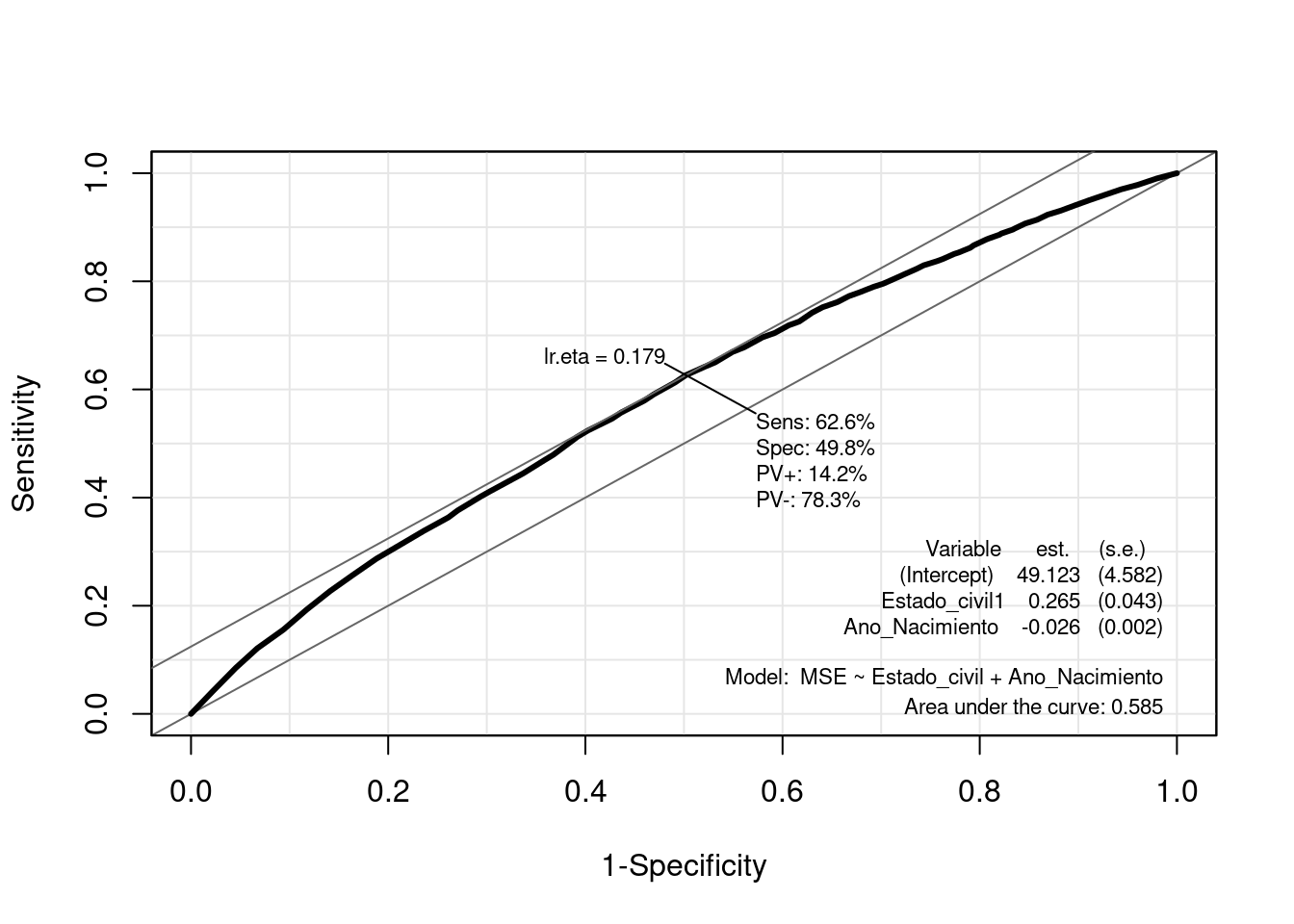 Destacar que el elemento Ir.eta que aparece arriba, es el punto de corte de la probabilidad. Es decir, si nuestra regresión logística predice que hay una probabilidad mayor de \(0.179\) de que haya mejorado la calidad de vida, nosotros lo clasificamos como que efectivamente ha mejorado y si es menor, lo clasificamos como que no.