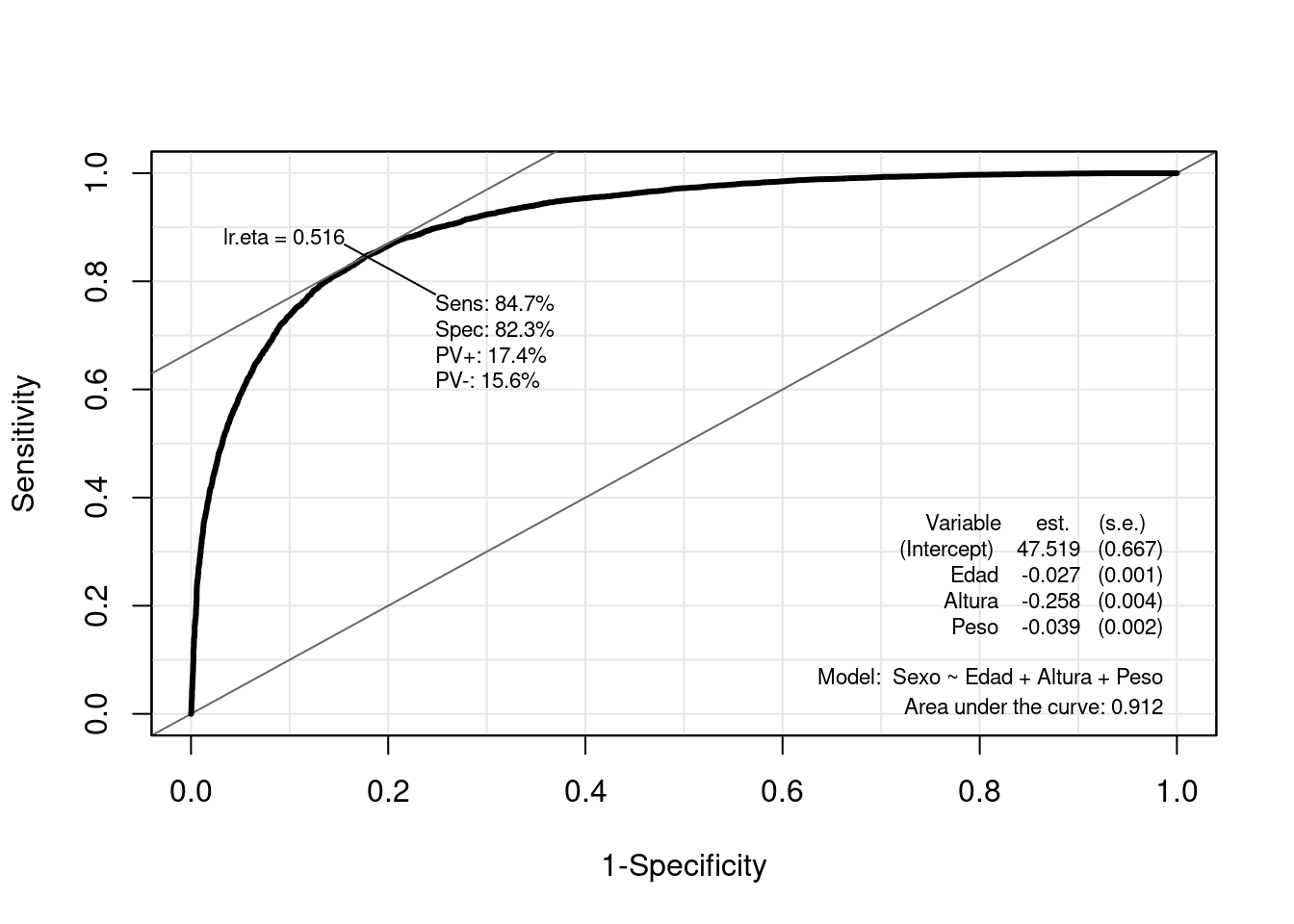 ROC(form = Sexo ~ Edad + Altura + Peso, data = datos, plot = "ROC", lwd = 3, cex = 1.5)