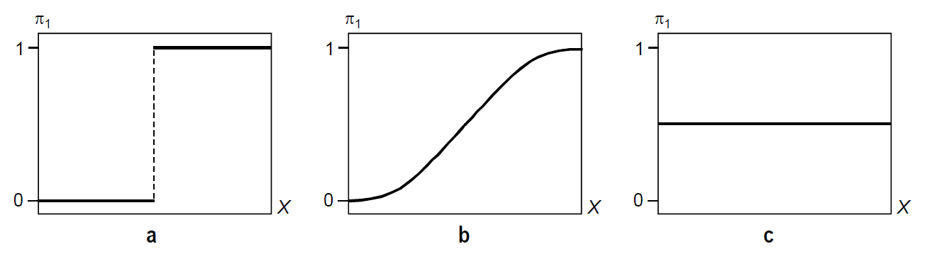 Esta imagen, sacada del libro Análisis de datos en Ciencias Sociales y de la Salud III (Pardo et al., 2012) muestra tres regresiones logísticas con el mismo coeficiente , pero distinto poder discriminante (diferente ): la curva de la izquierda tendría un poder de discriminación perfecto, mientras que la de la derecha no discrimina nada (la del medio sería un caso intermedio entre los dos extremos). Por lo tanto, podemos decir que una covariable será mejor predictora cuanto mayor sea el coeficiente \(\beta\) que genere. [Aclaración: en la imagen, \(\pi_1 = P(Y=1)\)]