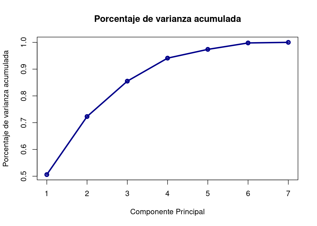 plot(summary(pca)$importance[3, ], type = "o", col = "darkblue", lwd = 3, main = "Porcentaje de varianza acumulada", xlab = "Componente Principal", ylab = "Porcentaje de varianza acumulada")