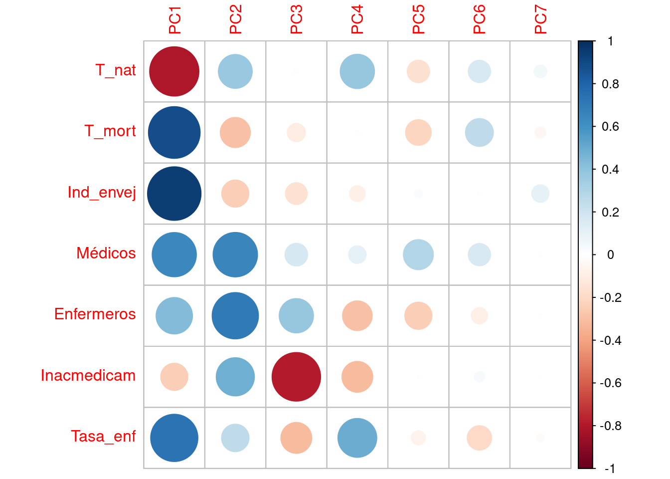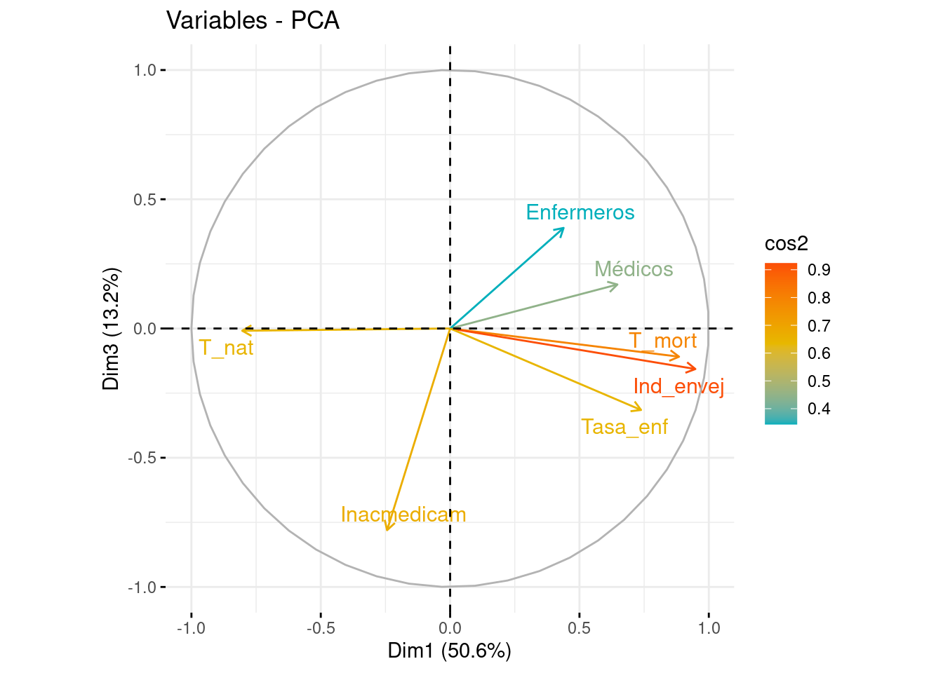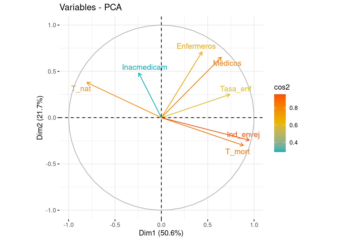 Si nos fijamos en el eje de abscisas, vemos como T_mort, Ind_envej, Tasa_enf y T_nat son las variables con menor ángulo respecto a él, indicando que han contribuido a la formación de la PC1. Las tres primeras variables se sitúan a la derecha del eje (contribución positiva), mientras que T_nat lo hace a la izquierda (contribución negativa). Es llamativo el pequeño ángulo formado por T_mort e Ind_envej, y es debido a la alta correlación entre ambas, que recordamos que era del 92%).
