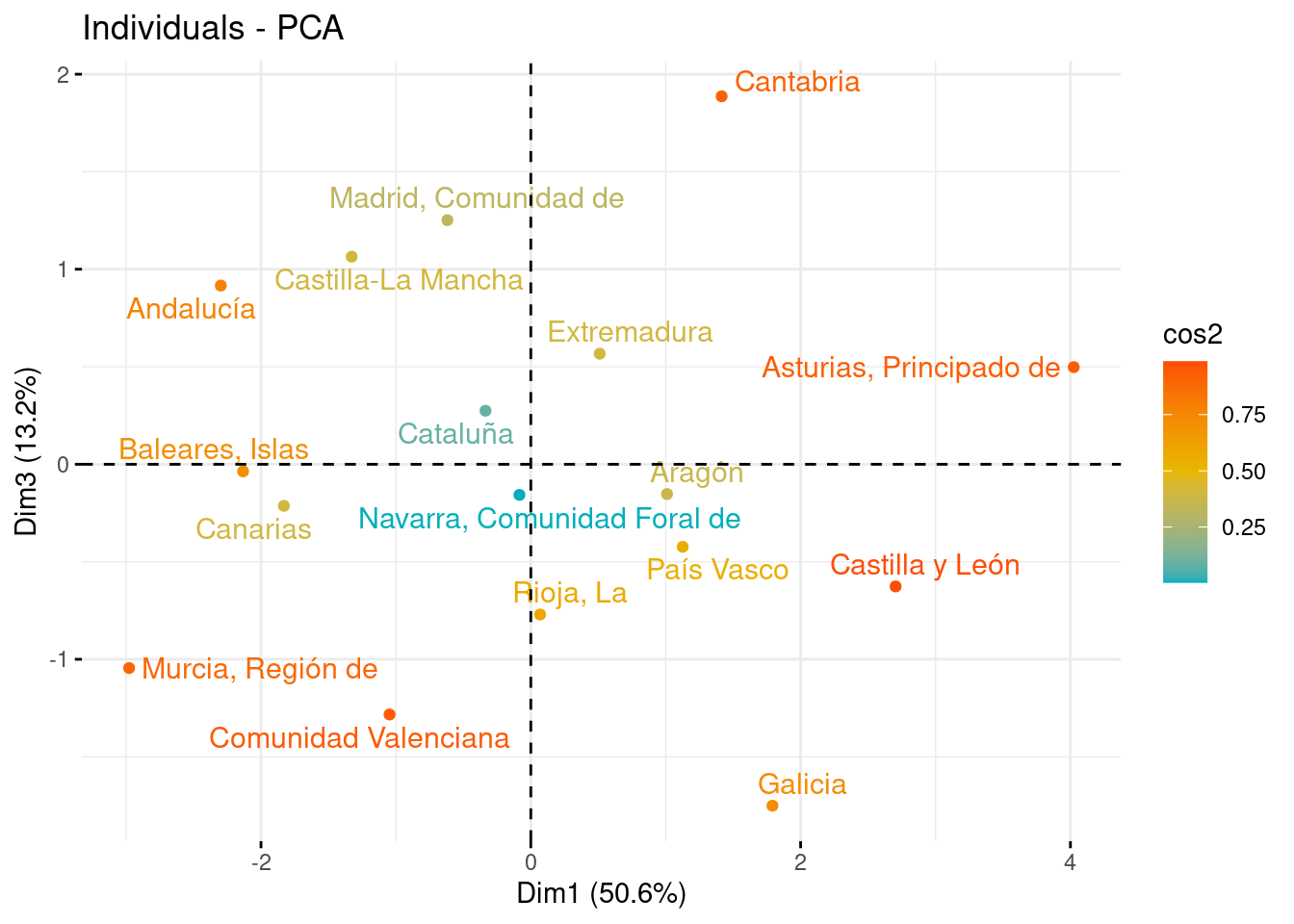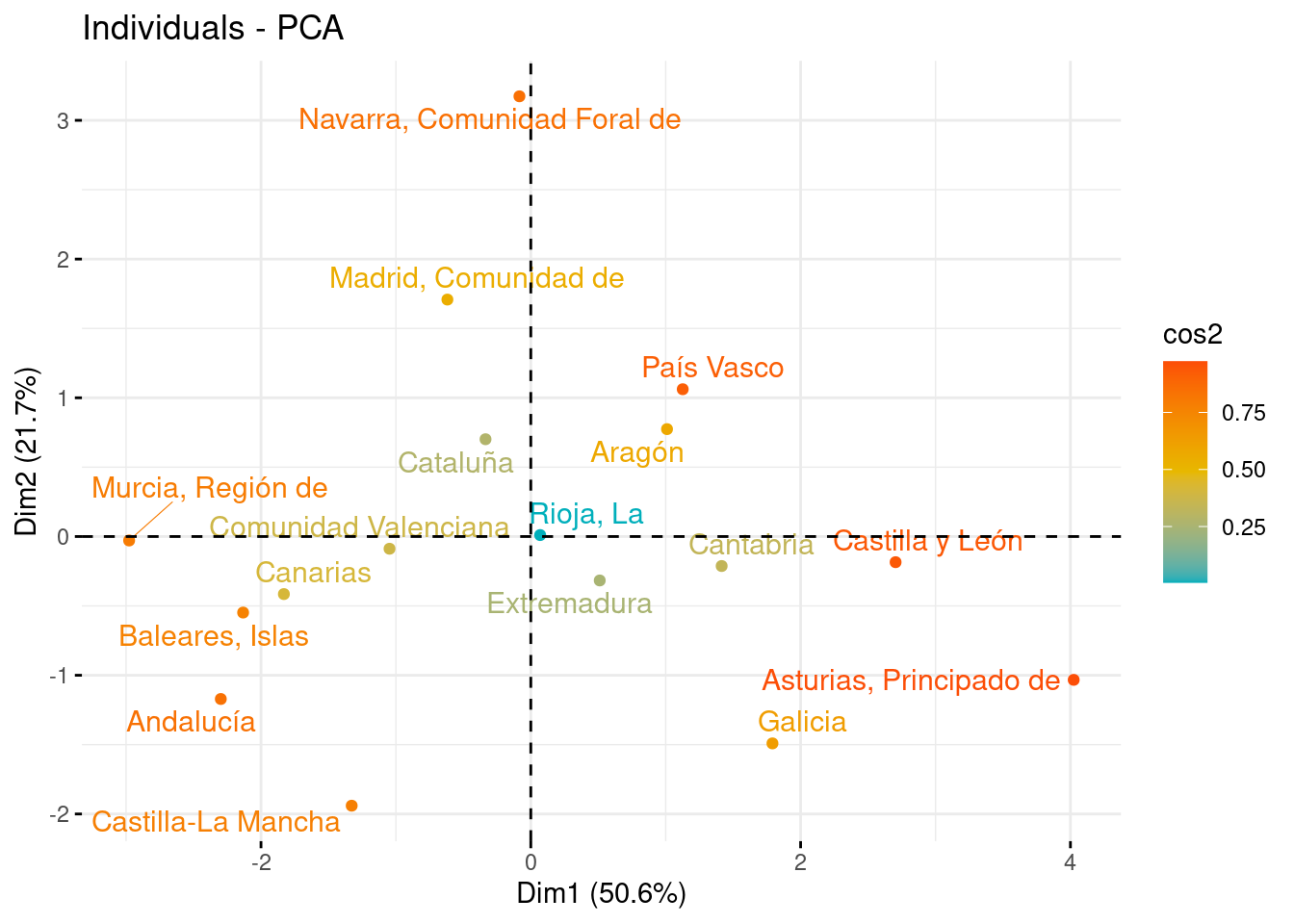Tras observar la representación de las variables, en este apartado vemos la representación de los individuos sobre los nuevos ejes, con la idea de que aquellos con características similares, se agrupan cerca al tener puntuaciones parecidas. Las comunidades con valores cercanos a la media se situarán cerca del centro del gráfico (0,0).