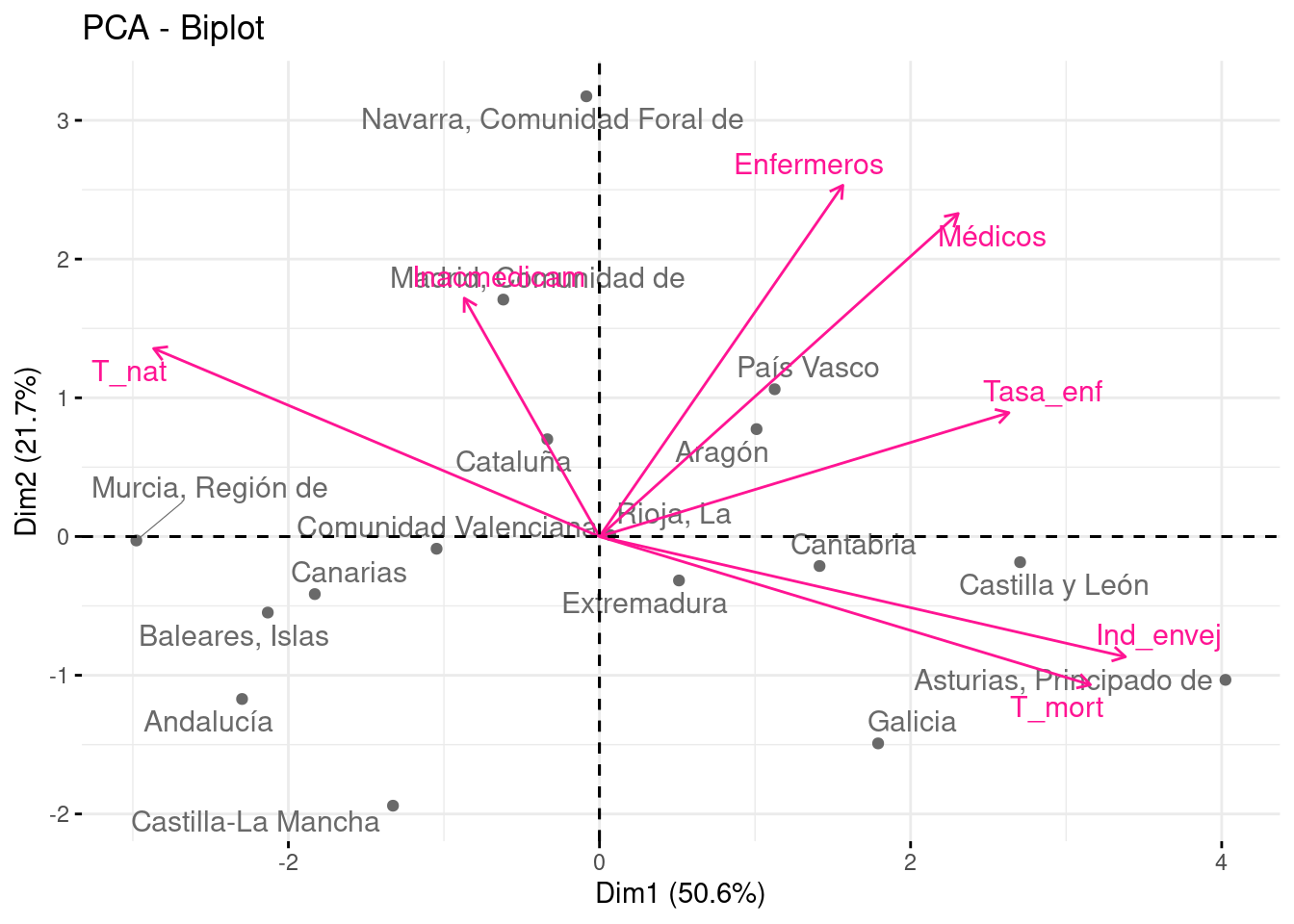 Respecto a los extremos del eje PC1, observamos dos grupos diferenciados. Por una parte, (Murcia, Canarias Baleares y Andalucía) son las CC.AA. con mayor tasa de natalidad; mientras que (Asturias, Galicia, Castilla y León) son las que tienen una población más envejecida y con mayor tasa de morbilidad por enfermedades.