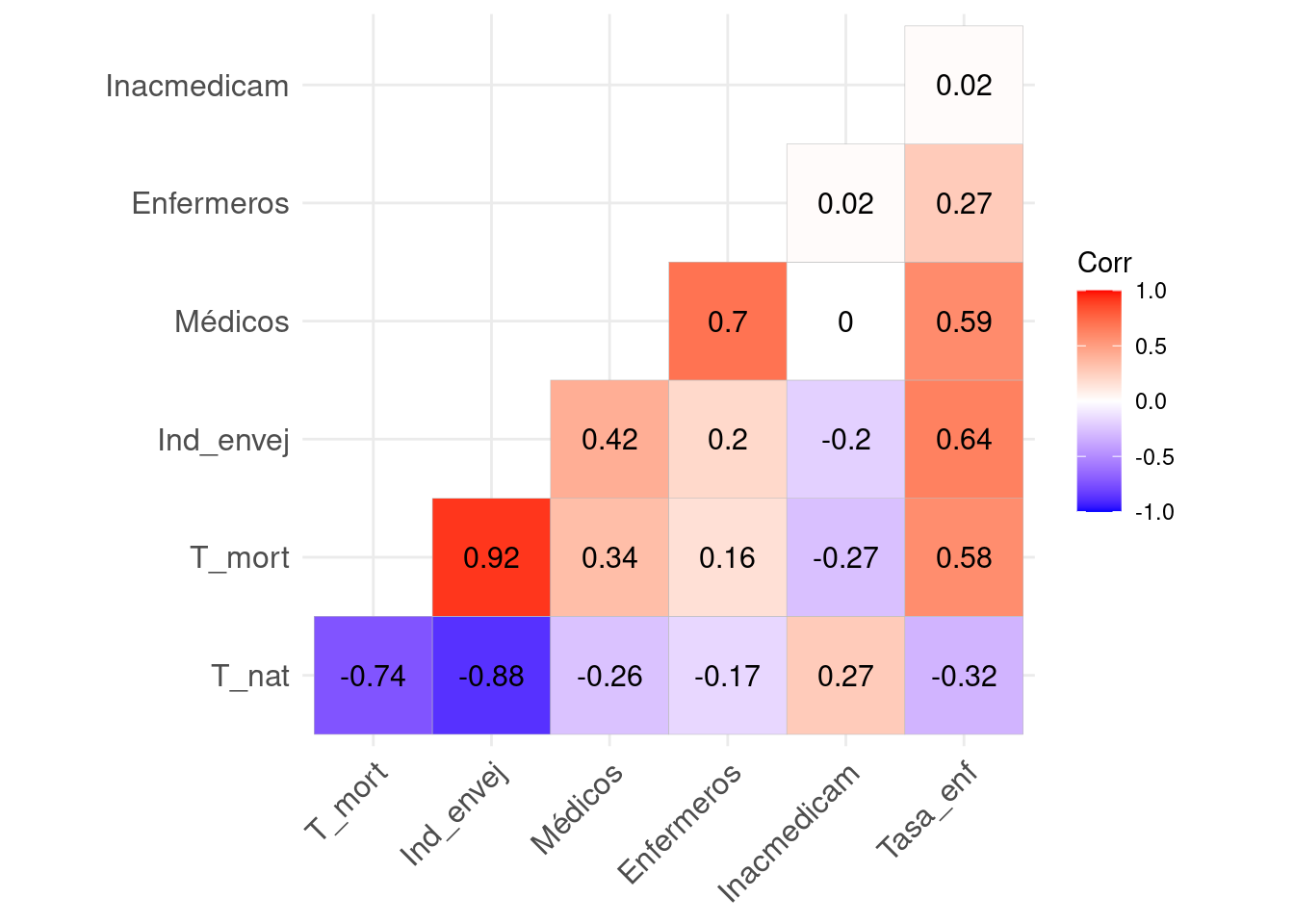 Hay varias correlaciones moderadas/altas como entre las variables T_nat y T_mort con 74% y T_nat e Ind_envej con 88%. Por otro lado con signo contrario, Médicos y Enfermeros 0.7%.