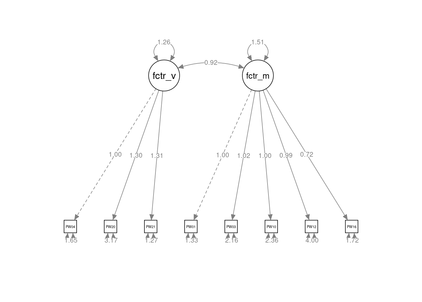 modelo_1F <- "Factor =~ PW010 + PW030 + PW040 + PW100 + PW120 + PW160 + PW200 + PW210"