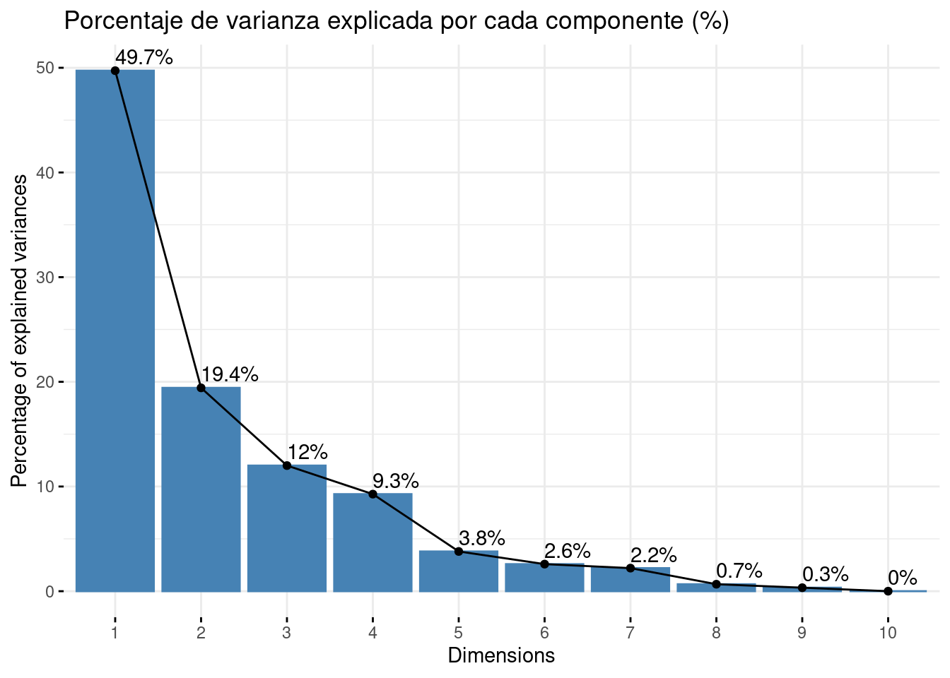# fviz_eig(pca, main="Varianza de cada componente", choice = "eigenvalue", addlabels = T)Como el porcentaje de varianza explicada por cada componente sobre el total.