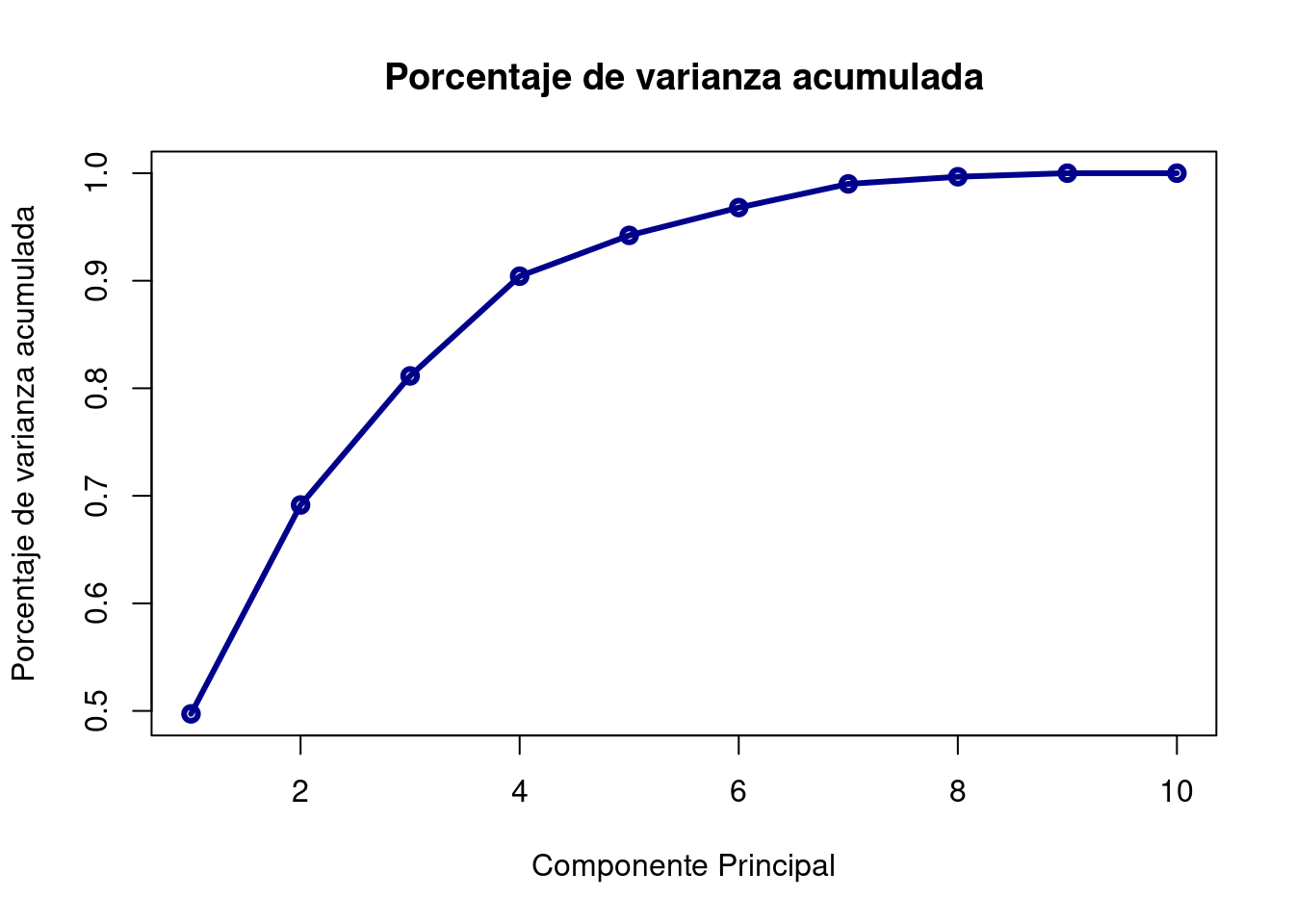 plot(summary(pca)$importance[3, ], type = "o", col = "darkblue", lwd = 3, main = "Porcentaje de varianza acumulada", xlab = "Componente Principal", ylab = "Porcentaje de varianza acumulada")