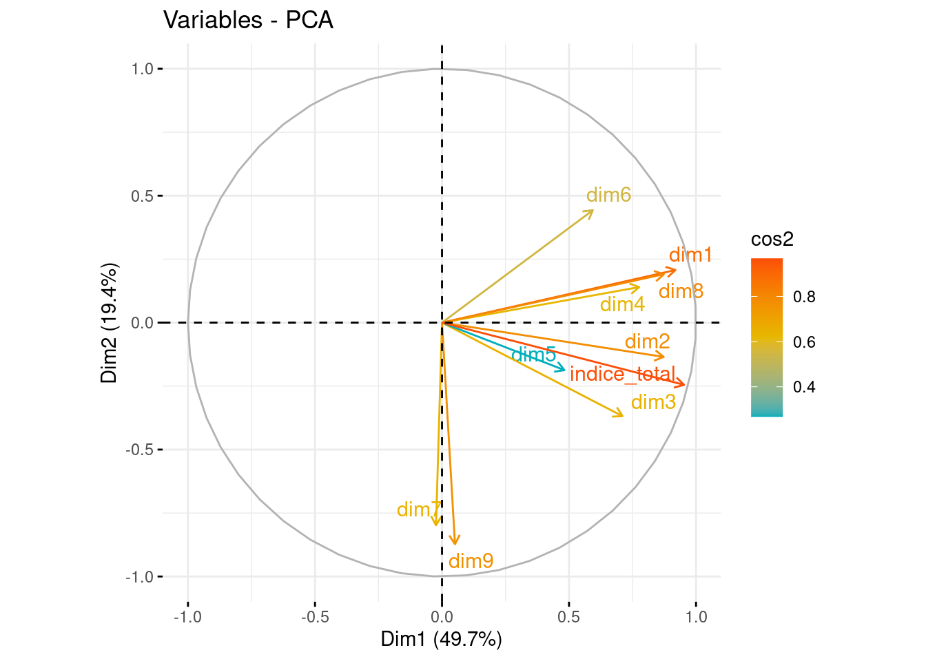 En el gráfico, diferenciamos por colores las variables según su calidad de representación en las dos primeras componentes. Cuanto más cerca esté una variable del círculo de correlaciones, mejor será su representación, por lo que las variables que estén muy cerca del centro de la gráfica son las menos importantes para las dos primeras componentes.