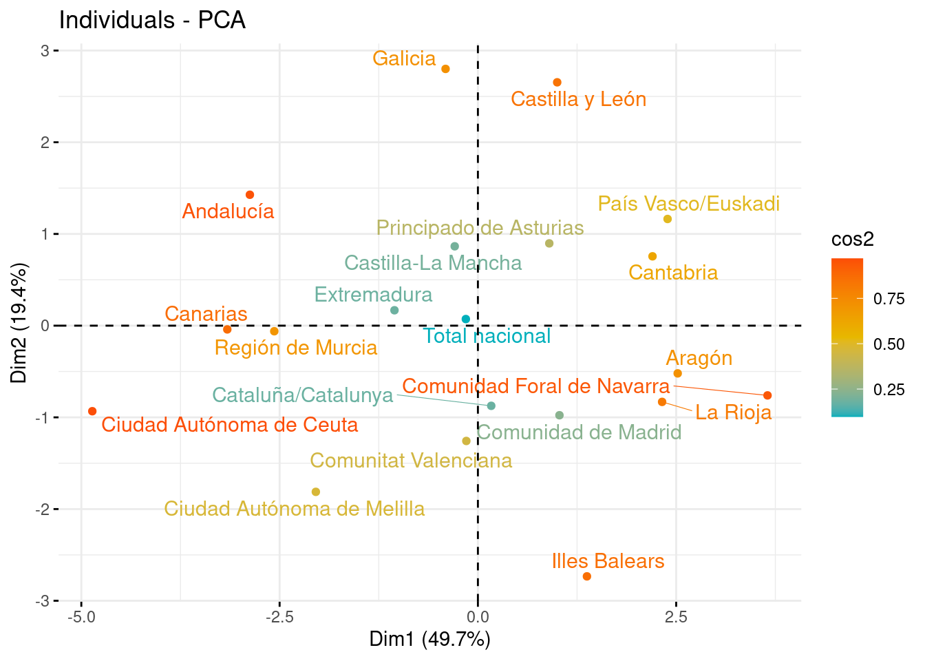 Tras observar la representación de las variables, en este apartado vemos la representación de los individuos sobre los nuevos ejes, con la idea de que aquellos con características similares, se agrupan cerca al tener puntuaciones parecidas. Las comunidades con valores cercanos a la media se situarán cerca del centro del gráfico (0,0).