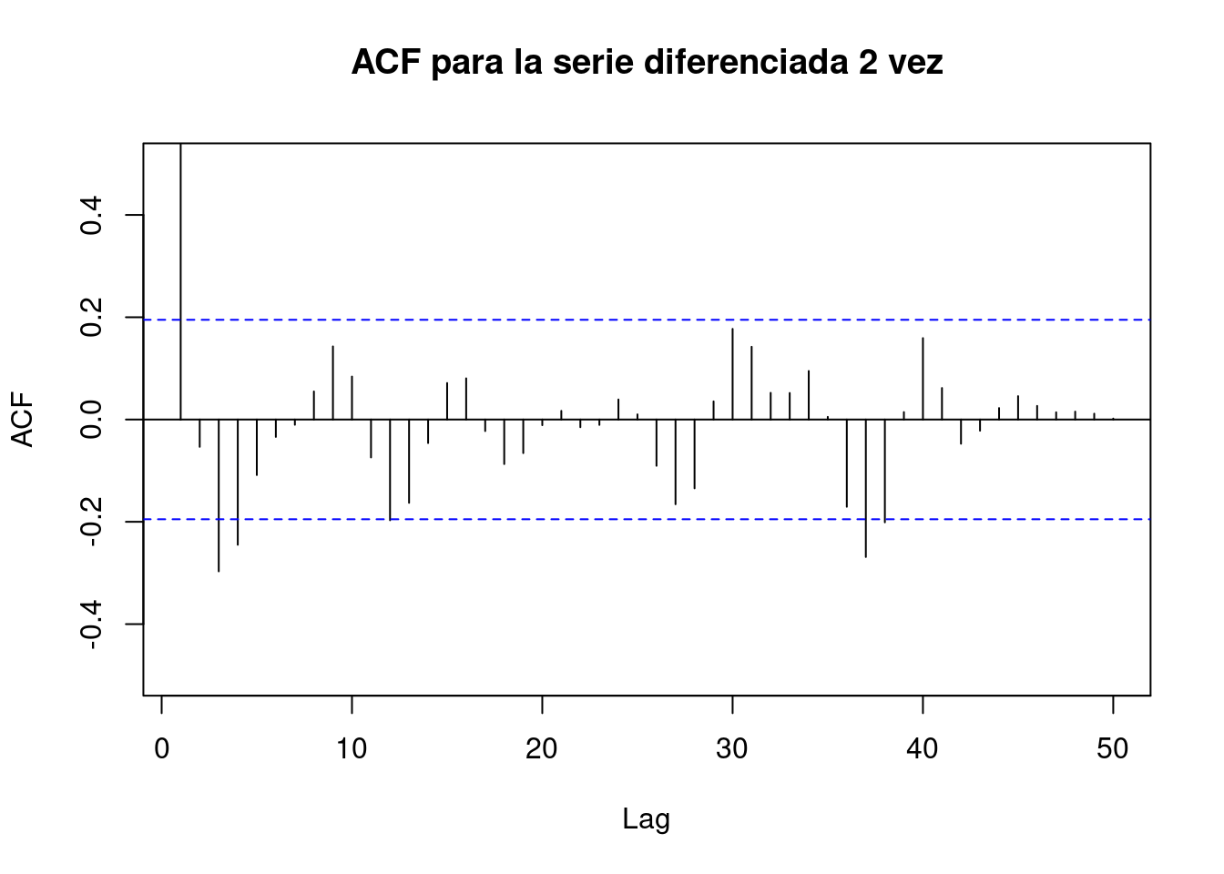 - Componente NO Estacional: Examinar los primeros lags (1,2,3,..). El número de picos en el ACF (con lags bajos) fuera de las bandas horizontales con un PACF que se reduce gradualmente indican MA no estacionales, determinando q. Lo mismo en la ACF indica p.