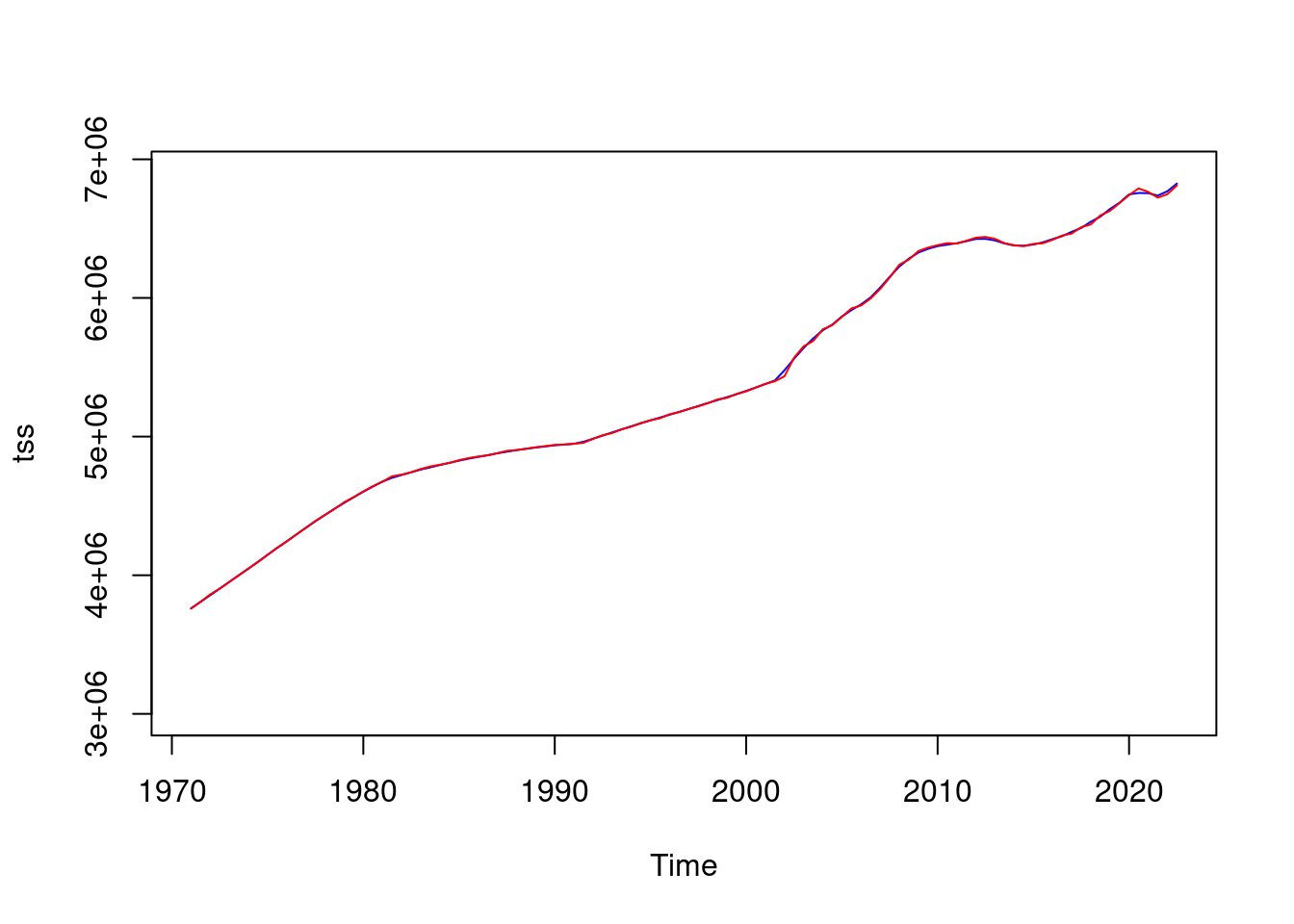 plot(tss, col = "blue", ylim = c(3000000, 6900000))