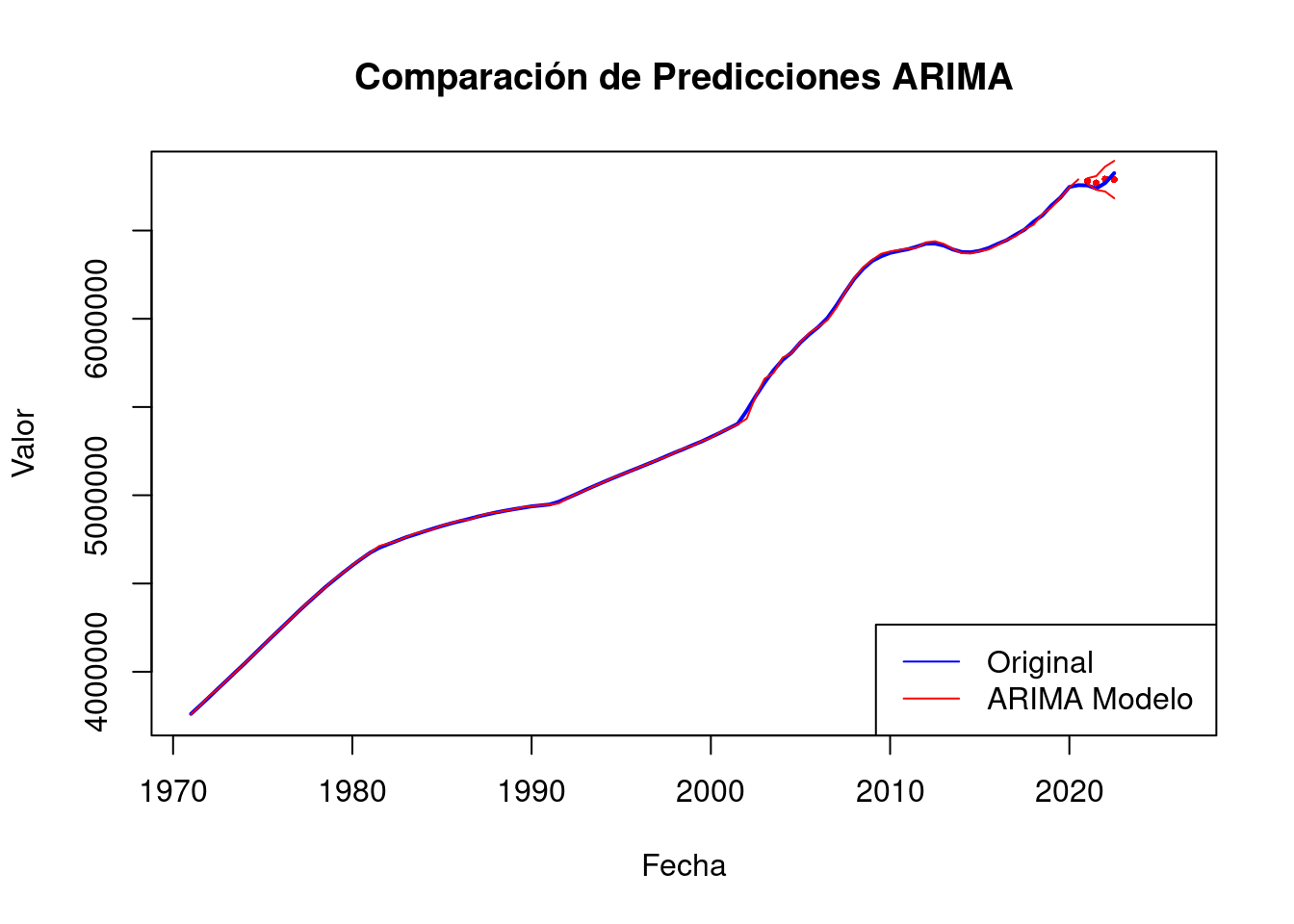legend("bottomright", legend = c("Original", "ARIMA Modelo "), col = c("blue", "red"), lty = 1)
