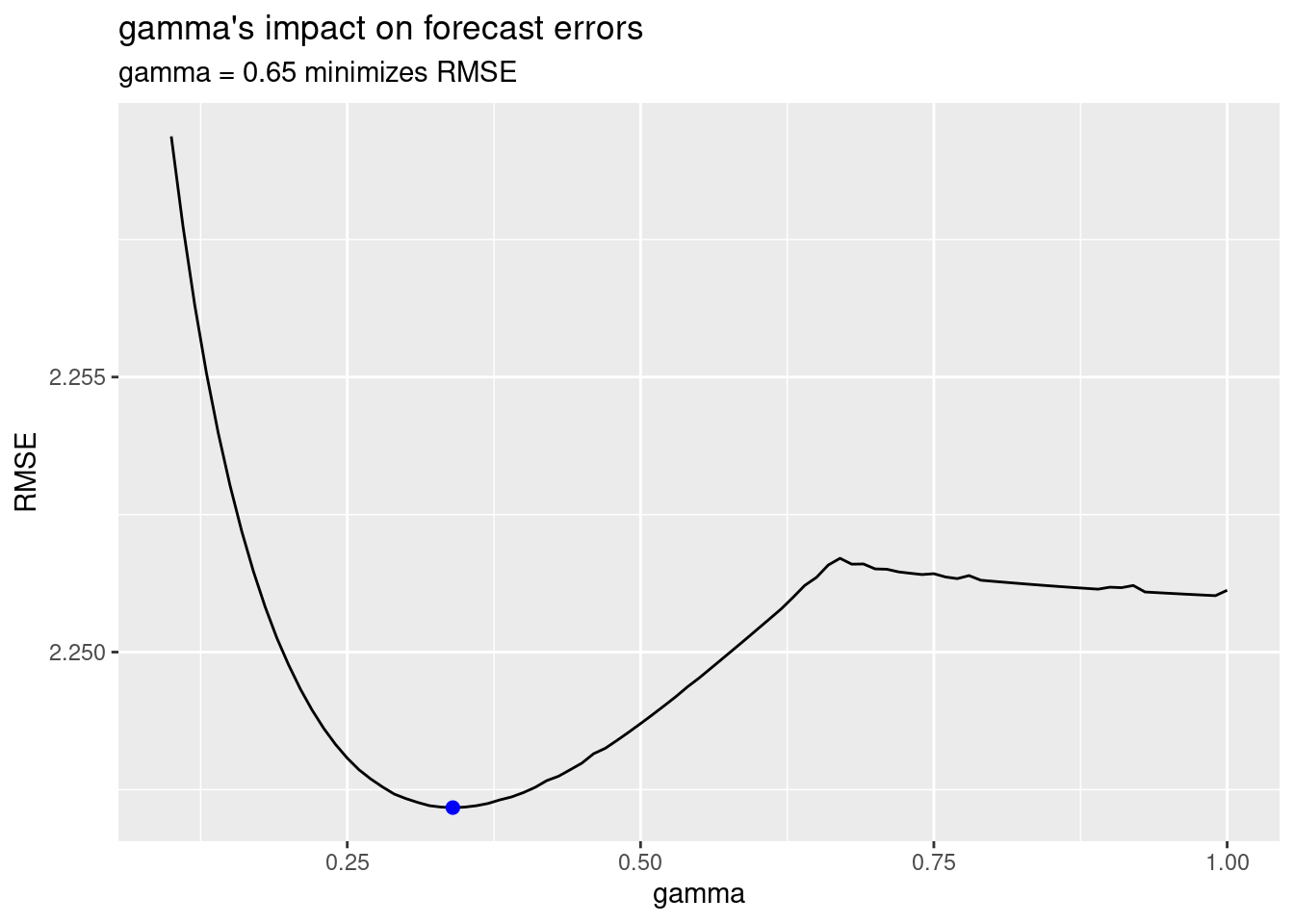 subtitle = "gamma = 0.65 minimizes RMSE"