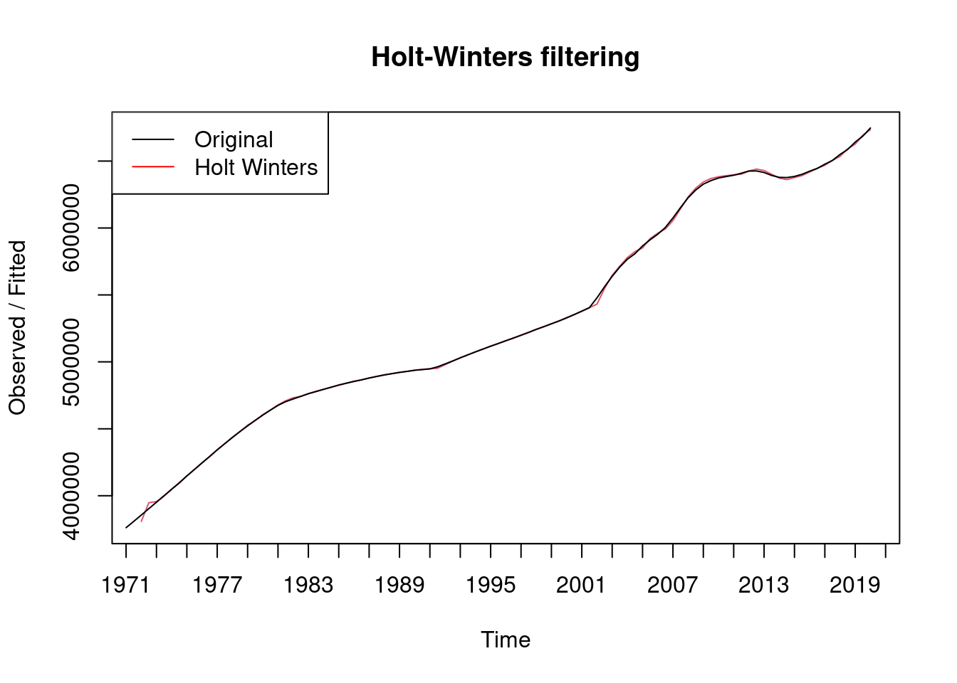 legend("topleft", legend = c("Original", "Holt Winters"), col = c("black", "red"), lty = 1)